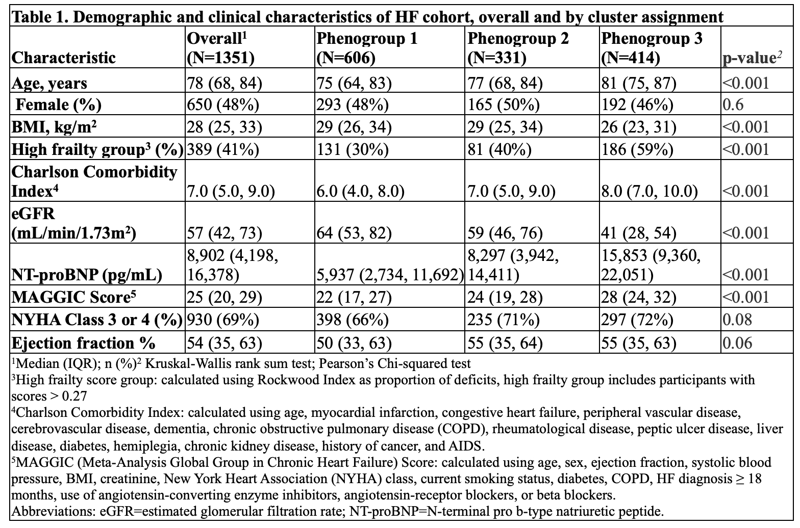 Abstract Body (Do not enter title and authors here): Background: Heart failure (HF) is a heterogeneous syndrome with high mortality. Previous work characterizing HF subgroups primarily relied on clinical data to cluster patients, an approach constrained by the boundaries of documented clinical features. Clustering based on biomarker data, such as proteomics, may provide insights into underlying molecular processes. However, few studies have used this approach, and all used targeted cardiovascular proteomics panels and a restricted HF ejection fraction group. Hypothesis: We used unsupervised clustering analysis to characterize molecular phenogroups in a population-based HF cohort using a large-scale array of circulating plasma proteins. We hypothesized that distinct proteomic-defined phenogroups would exhibit differences in clinical characteristics, mortality, and protein expression. Methods: We measured 7151 SOMAmers (Slow off-rate modified aptamers) targeting human proteins via the SomaLogic 7K SomaScan assay in 1351 HF patients. After feature selection, 831 SOMAmers were used in k-means clustering of patients via R package “ConsensusClusterPlus.” Phenogroups were compared for clinical characteristics, all-cause mortality, and protein expression. Results: Three phenogroups were identified, exhibiting different clinical characteristics (Table 1) and survival probabilities (5-year survival probability in phenogroup 1: 65% [61%, 68%], phenogroup 2: 45% [40%, 51%], and phenogroup 3: 26% [22%, 30%]). In covariate-adjusted Cox models, membership in phenogroups 2 and 3 was significantly associated with increased rate of mortality compared to phenogroup 1. Phenogroups did not differ by ejection fraction or New York Heart Association class. Pathway overrepresentation analysis of differentially expressed SOMAmers identified pathways associated with inflammatory response and immune cell trafficking. Conclusions: Unsupervised clustering analysis using large-scale proteomics data identified three HF phenogroups with different proteomic signatures, clinical characteristics, and outcomes. Future work is necessary to elucidate how molecular differences contribute to heterogeneity in HF to improve risk stratification beyond current recommended clinical guidelines.