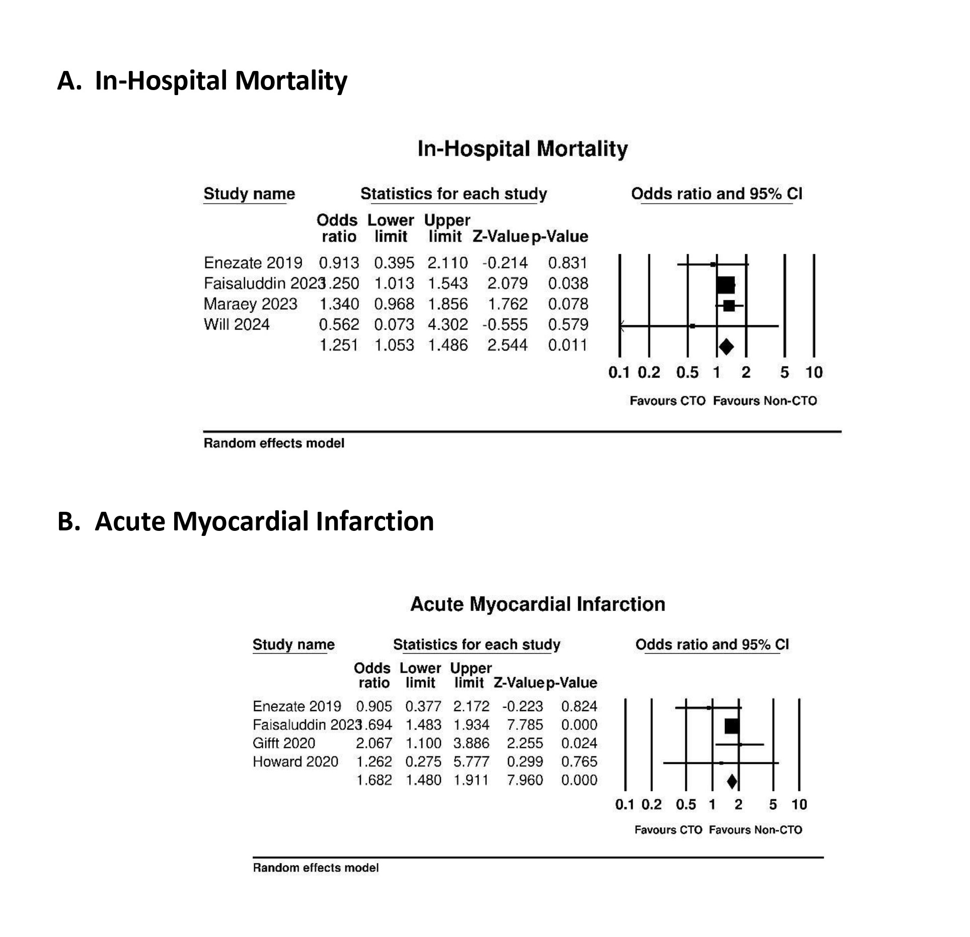 Methods We conducted a thorough literature search across major bibliographic databases, including PubMed, Embase, Cochrane Library, and SCOPUS, from their inception until May 15, 2024, to identify studies comparing outcomes of TAVR in patients with and without CTO. Pooled odds ratios (OR) with 95% confidence intervals (CIs) were calculated using the random-effects model via Comprehensive Meta-Analysis Software. The primary outcome assessed was in-hospital mortality, with several secondary endpoints also evaluated. Statistical significance was determined at p<0.05.