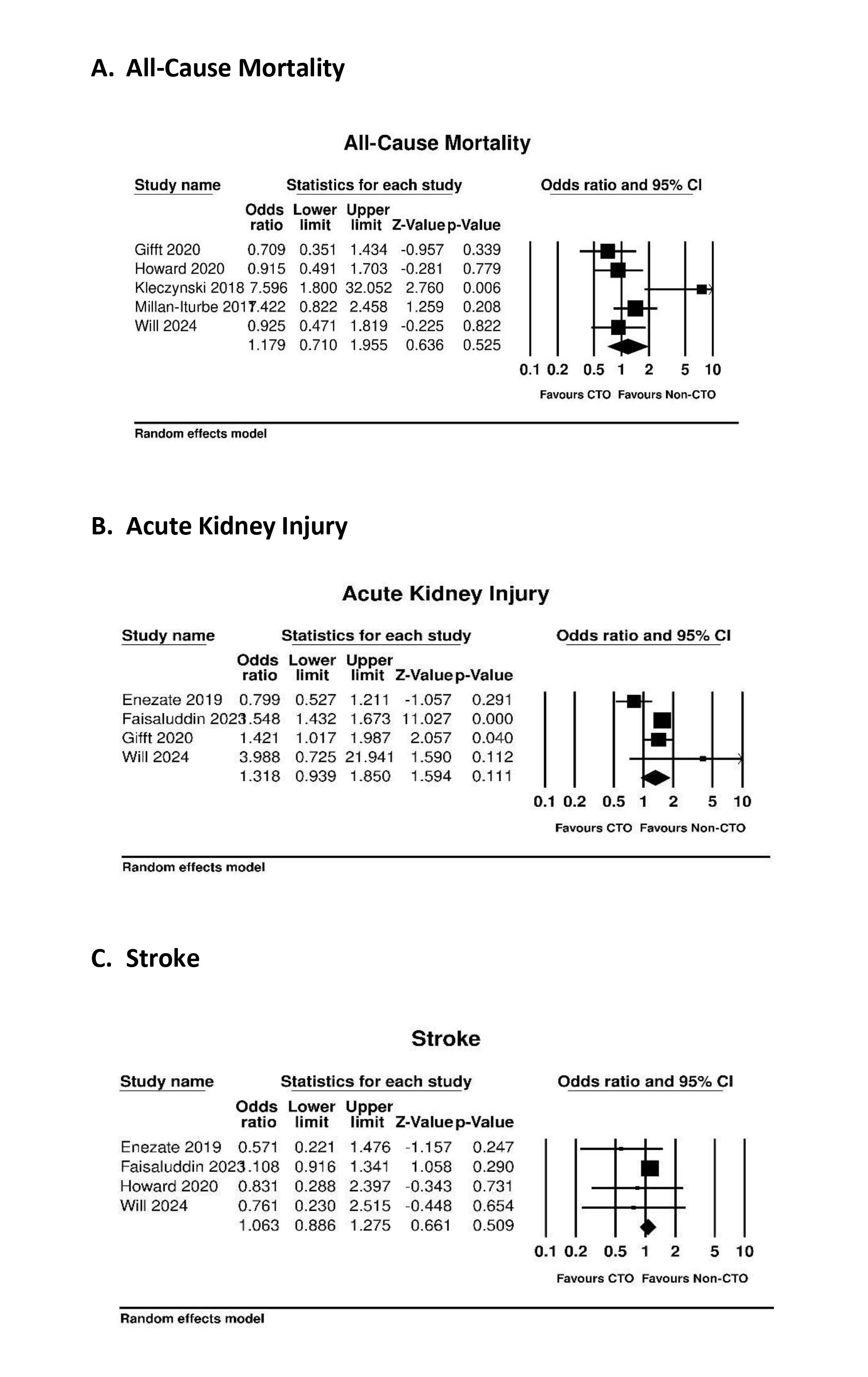 Results Eight studies, encompassing a total of 540,910 patients undergoing TAVR (11,679 with CTO; 529,231 without CTO), were included in this meta-analysis. TAVR in patients with CTO was associated with significantly increased odds of in-hospital mortality (OR: 1.25; 95% CI: 1.05, 1.49; p=0.011; I2=0%) and acute myocardial infarction (periprocedural) (OR: 1.68; 95% CI: 1.48, 1.91; p<0.001; I2=0%). However, no significant difference was observed in all-cause mortality (OR: 1.18; 95% CI: 0.71, 1.96; p=0.525; I2=59.37%), acute kidney injury (OR: 1.32; 95% CI: 0.94, 1.85; p=0.11; I2=72.12%), and stroke (OR: 1.06; 95% CI: 0.89, 1.28; p=0.509; I2=0%) (see Figures 1 and 2).