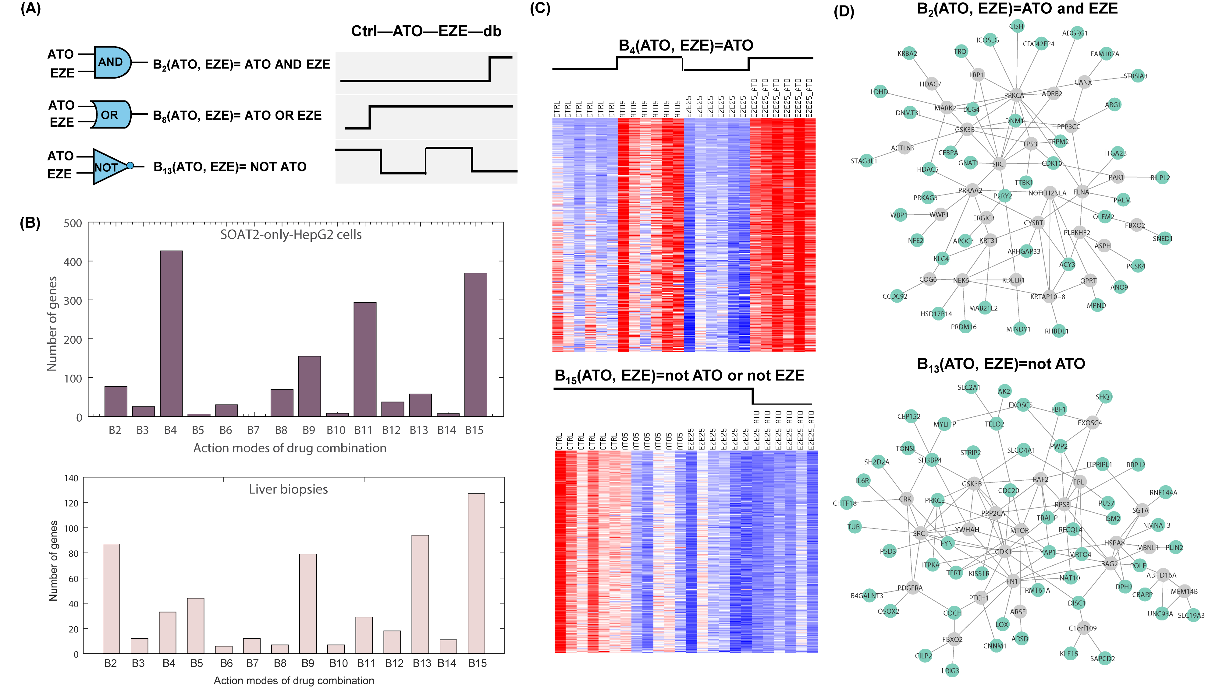 Abstract Body (Do not enter title and authors here): Introduction: Drug combinations offer increased therapeutic efficacy and reduced toxicity and plays a vital role in treating chronic complex diseases. Understanding a drug combination's mechanism of action (MoA) can provide important insights into its therapeutic efficacy. The MoA of many FDA-approved drugs, however, often remains unclear. Methods: In this study, we investigated the combination of a statin [atorvastatin (ATO) or simvastatin (SIM) plus ezetimibe (EZE)] and utilized drug-treated RNA-seq transcriptome data from SOAT2-only-HepG2 cells (treated with ATO 5 umol/L, EZE, 25 umol/L, their combination or vehicle) and from liver biopsies of patients with uncomplicated cholesterol gallstone disease in the Stockholm Study (a single-blind, randomized trial with SIM 80 mg daily, EZE 10 mg daily, their combination, or placebo) to decipher the underlying molecular mechanisms of the drug combination. We proposed a Boolean logical modeling framework to simulate the MoA of a drug combination. Specifically, fourteen two-variable Boolean models were used to describe the combinatory relationships of ATO/SIM and EZE. Thereafter, a pattern matching approach was applied to associate drug-induced differentially expressed genes with the idealized differential expression templates derived from Boolean models. Results: We found 1,560 and 594 genes differentially expressed in at least one treatment condition in SOAT2-only-HepG2 cells and liver biopsies, respectively. Our analysis revealed both expected and novel combinatorial modes of ATO/SIM and EZE. For example, ATO independently activates downstream genes (i.e. B4(ATO,EZE)=ATO), and ATO and EZE synergistically inhibits downstream genes (i.e. B15(ATO,EZE)=NOT (ATO AND EZE)) , as the two most prevalent MoAs in SOAT2-only-HepG2 cells (Figure 1). Similarly, the combination of SIM and EZE synergistically inhibiting downstream genes was also the most prevalent MoA in the liver biopsies. We mapped the downstream genes of each combinatorial mode to the human interactome and obtained underlying subnetworks, which are important for understanding the therapeutic effects of the drug combination. Functional enrichment and disease-association analyses of the downstream suggest the additional therapeutic indications of the drugs. Conclusion: Drug-induced transcriptomes are informative in deciphering the MoA of drug combinations using Boolean logical modeling. This framework can be easily extended to the combinations of three drugs.