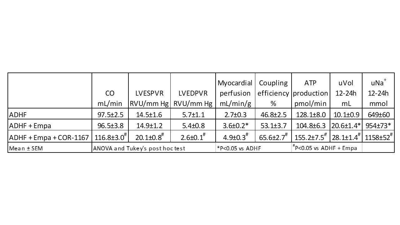 Abstract Body (Do not enter title and authors here): Introduction: Urocortin-2 (UCN-2) is a peptide belonging to the corticotropin-releasing factor family that has cardiovascular, renal, metabolic and anti-inflammatory actions and improves cardiac function in human heart failure (HF) and cardiorenal dysfunction in chronic HF models. However, UCN-2 has a short half-life and intravenous delivery limits its therapeutic use. COR-1167 was discovered as a stable UCN-2 analog with qd pharmacological effects when injected subcutaneously. Hypothesis: Whether COR-1167 exerts chronic cardiorenal protection in Acute Decompensated HF (ADHF) is unknown, and in particular on background of SGLT2 inhibition, therefore both treatments were tested in a rat model of ADHF. Methods: Rats had coronary artery ligation to induce MI and a reduced ejection fraction phenotype. Three months later, rats were treated with vehicle or Empagliflozin (Empa) at 10 mg/kg/day PO. One month after starting Empa, two acute decompensation events were induced by administrating NaCl solution (1.8 g/kg, PO) on Day 0 and Day 14. Empa treated ADHF rats received vehicle or COR-1167 (3 µg/kg/day) by SC injections starting at 12 hours after the first decompensation and all treatments continued for 14 days. The groups were ADHF, ADHF + Empa and ADHF + Empa + COR-1167 (n=7-10/group). Left ventricular (LV) hemodynamics (cardiac catheters), cardiac output (echocardiography) and LV tissue perfusion (magnetic resonance imaging), cardiac mitochondrial coupling and ATP production (Seahorse) were measured 1 day after the second decompensation, while urine volume (uVol) and urine Na+ excretion (uNa+) collected from metabolic cages were analyzed 7 days after the first decompensation. Results: Compared to ADHF control rats, Empa treatment had no effect on systolic blood pressure (SBP), cardiac output (CO), LV end systolic pressure volume relationship (LVESPVR), LV end diastolic pressure volume relationship (LVEDPR), mitochondrial coupling and ATP production, but it increased myocardial perfusion, uVol and uNa+ excretion. Compared to ADHF + Empa rats, COR-1167 treatment increased SBP, CO, LVESPVR, myocardial perfusion, mitochondrial coupling and ATP production, uVol, uNa+, while decreasing LVEDPVR. Conclusion: In the setting of ADHF, significant cardiorenal benefits and decongestion occurred when COR-1167 was administered on top of an SGLT2 inhibitor.