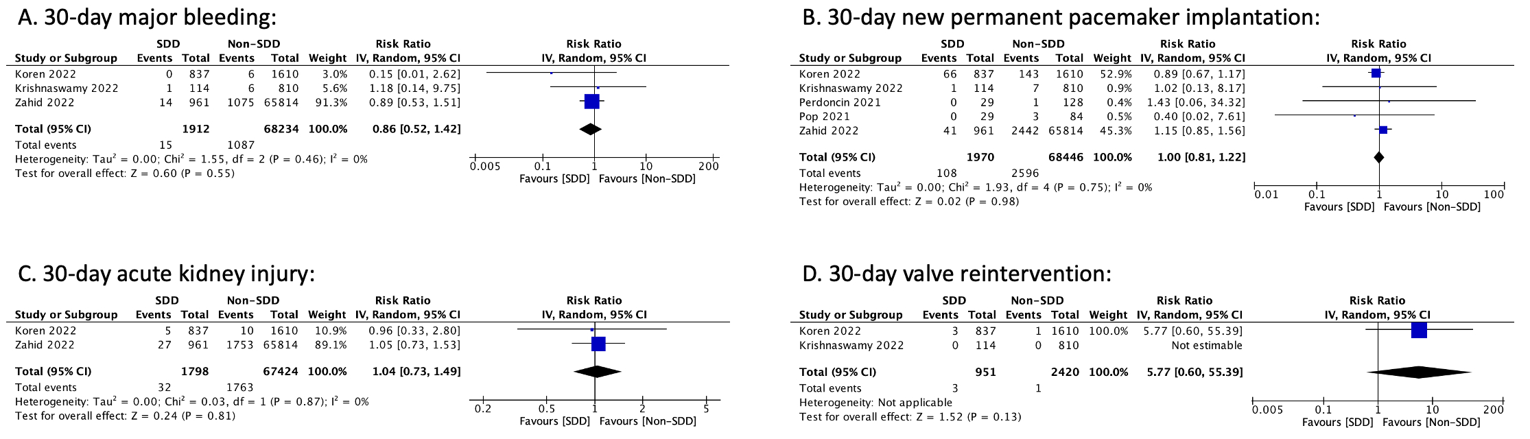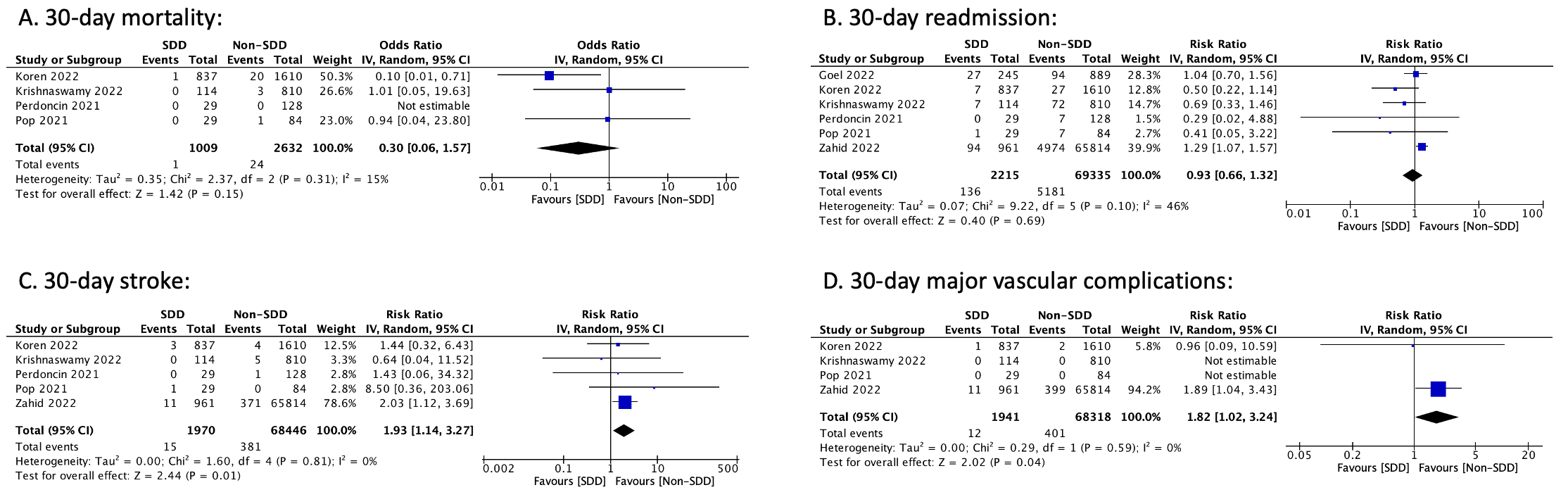 Results: Six studies were included with 71,550 patients undergoing TAVR (2215: same-day discharge; 69335: later-day discharge). The mean age for the same-day and later-day discharge groups was 77.3 ± 8.3 and 78.3 ± 8.5, respectively. Same-day discharge for patients post-TAVR was associated with a higher risk of 30-day stroke [RR: 1.93; 95% CI: 1.14, 3.27] and 30-day major vascular complications [RR: 1.82; 95% CI: 1.02, 3.24] as compared to later-day discharge post-TAVR. However, no significant differences in the risks of 30-day mortality [RR: 0.30; 95% CI: 0.06, 1.57], 30-day readmission [RR: 0.93; 95% CI: 0.66, 1.32], 30-day major bleeding [RR: 0.86; 95% CI: 0.52, 1.42], 30-day new permanent pacemaker [RR: 1.00; 95% CI: 0.81, 1.22], 30-day acute kidney injury [RR: 1.04; 95% CI: 0.73, 1.49], and 30-day valve reintervention [RR: 5.77; 95% CI: 0.60, 55.39] were noted between the two groups.