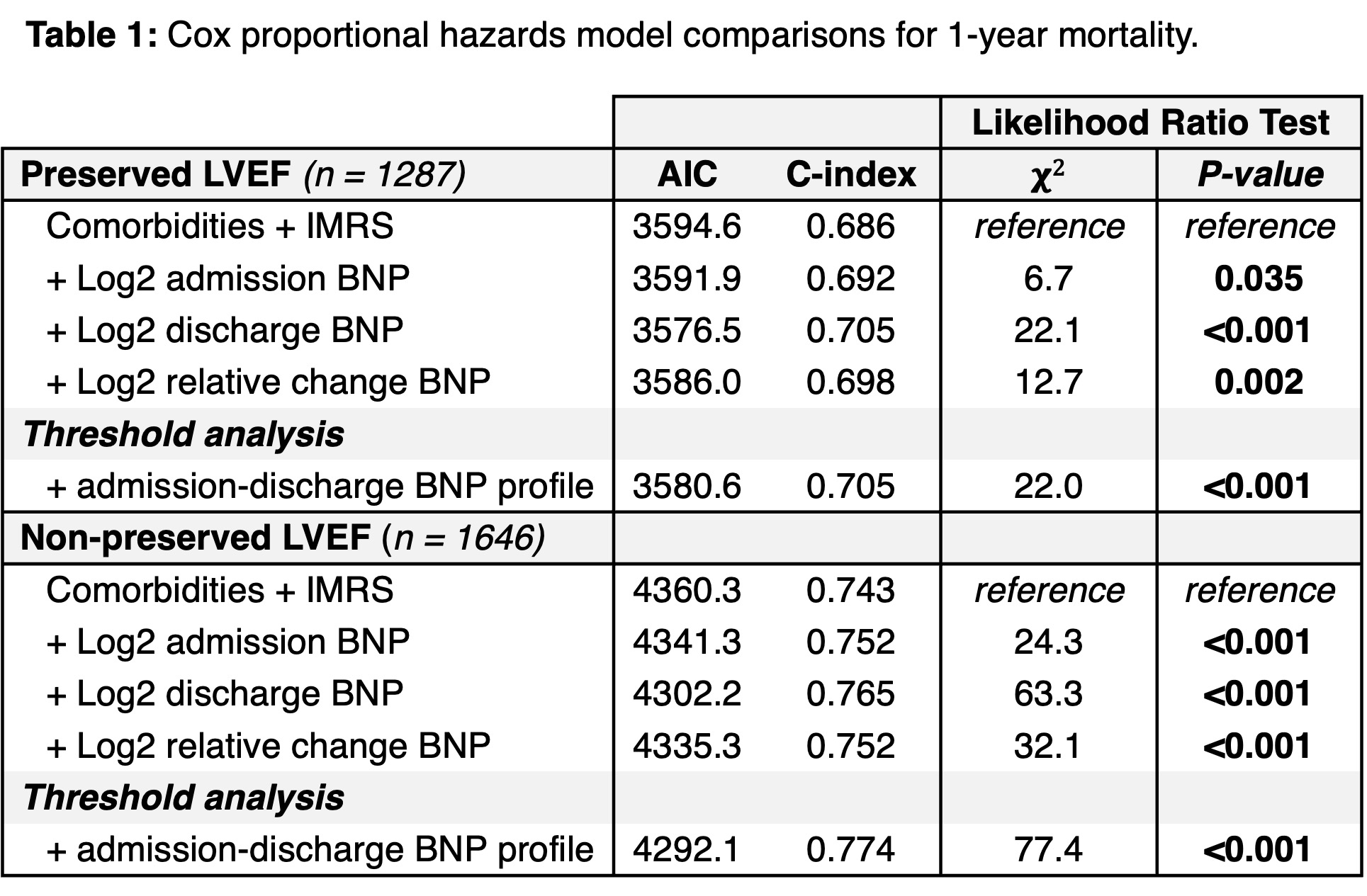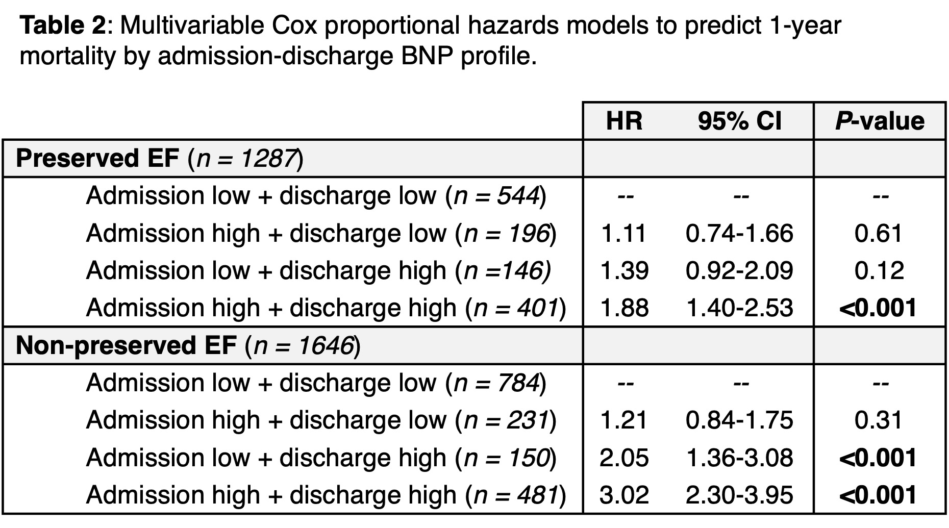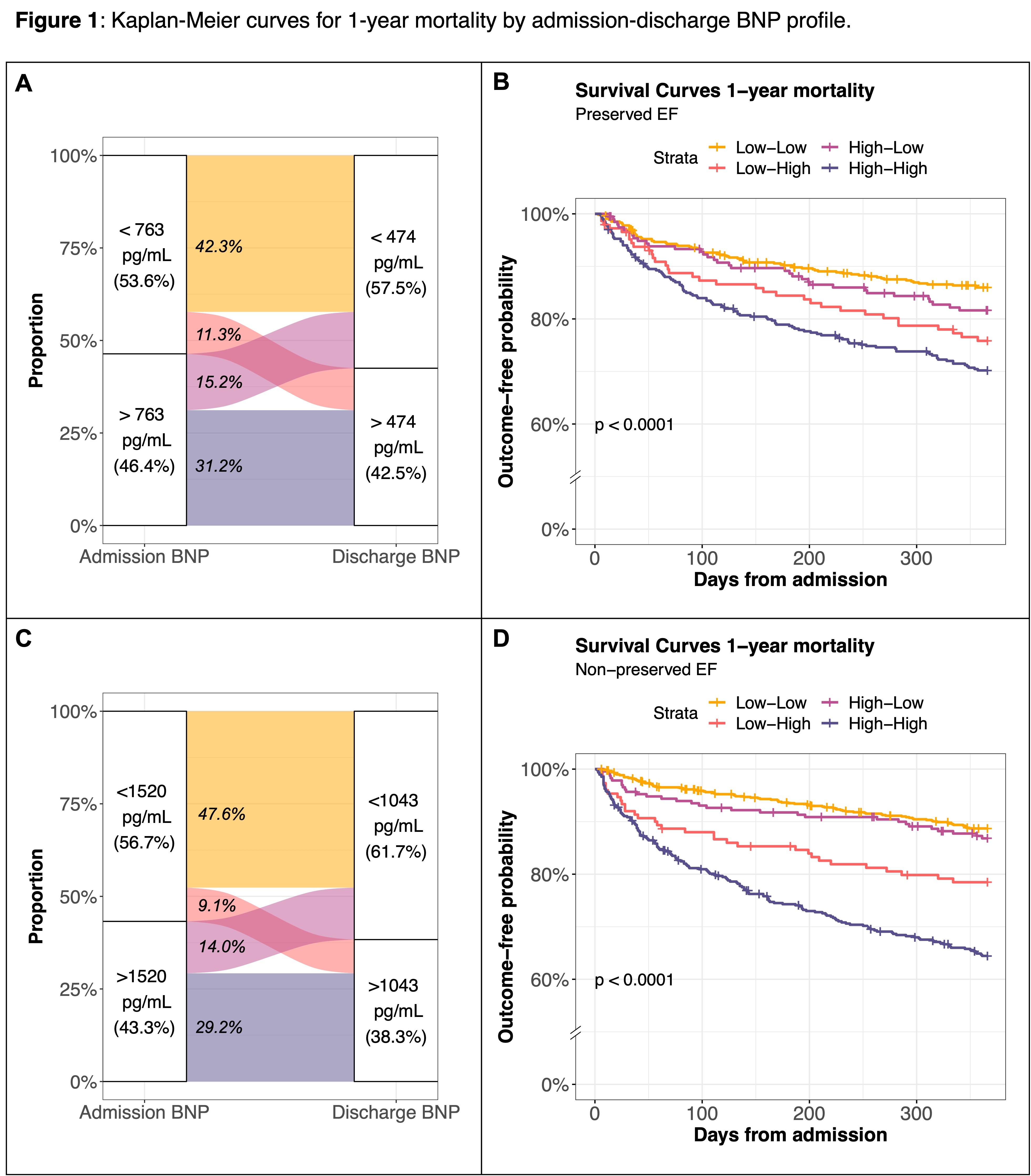 Abstract Body (Do not enter title and authors here): Introduction: Pre-discharge and in-hospital trends of B-type natriuretic peptide (BNP) are predictive of mortality in patients recently discharged after acute decompensated heart failure (ADHF). The Intermountain risk score (IMRS) uses common serum laboratory data to predict outcomes in hospitalized patients. Considering that in-hospital BNP levels differ for HF with preserved (HFpEF) and HF with non-preserved EF (HFnpEF), the goal of this work was to assess whether BNP at admission and discharge provided prognostic information beyond the IMRS in either phenotype. Methods: In a hospitalized cohort with ADHF in Intermountain Health, adult patients were included if they had 1) a BNP value within 24 hours of admission, and 2) a separate BNP value within 3 days pre-discharge. HF phenotypes were determined using echocardiography within 1 year prior to admission (HFpEF >= 50%, HFnpEF < 50%). IMRS calculated on admission from CBC and CMP components. Within each HF phenotype, time-dependent ROC analyses were used to derive admission and discharge BNP thresholds for 1-year mortality (highest product of sensitivity and specificity). Patients were categorized as above or below their HF-specific admission and discharge thresholds (low-low, low-high, high-low, high-high). Nested multivariable Cox proportional hazard models for 1-year mortality evaluated admission BNP, discharge BNP, relative change in BNP, and admission-discharge BNP profile, in addition to IMRS and comorbidities. Results: A total of 2,933 patients were included, where 43.9% (1,287) had HFpEF and 56.1% (1,646) HFnpEF. Median BNP was lower in HFpEF compared to HFnpEF (admit: 703 vs 1300 pg/mL; discharge: 406 vs 796 pg/mL, both p<0.001). In HFpEF, admission and discharge BNP thresholds were 763 pg/mL and 474 pg/mL, respectively, while in HFnpEF, the thresholds were 1520 pg/mL, and 1043 pg/mL. The best model above the baseline model used admission-discharge BNP profile (Table 1). In both HF phenotypes, the low-low profile had the lowest 1-year mortality, and the high-high profile had the highest mortality (Figure 1). After multivariable adjustment, each admission-discharge BNP profile was associated with higher 1-year mortality vs. low-low, meeting significance in high-high profile in HFpEF and high-high and low-high profiles in the HFnpEF (Table 2). Conclusions: The inclusion of admission-discharge BNP profiles was complementary and added significant and incremental value to the IMRS to predict mortality.