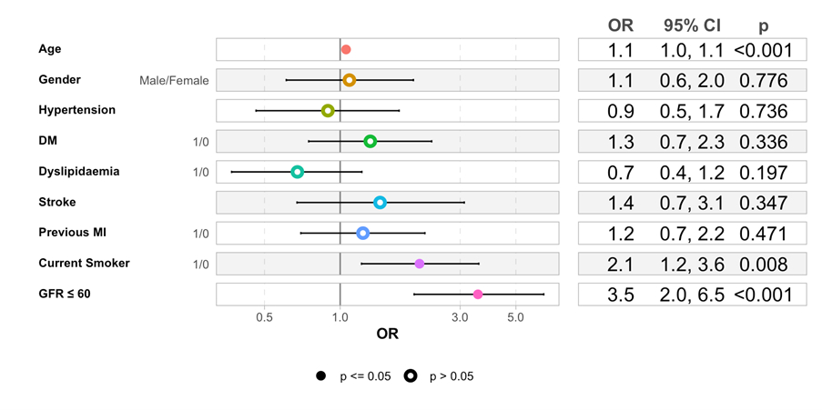 Results: 1553 (51%) patients were true-positive STEMI, while 1439 (49%) were masquerading STEMI. In the masquerading STEMI cohort, age, current smoking, and CKD (eGFR<60) were significant predictors of the 2-year cardiovascular death, MI stroke with OR of 1.05, 2.07, and 3.58, respectively (p<0.05 for all). Diabetes predicted MI re-presentation within 2 years (OR 3.76, p<0.05), and CKD predicted heart failure hospitalisation (OR 2.55, p<0.05).