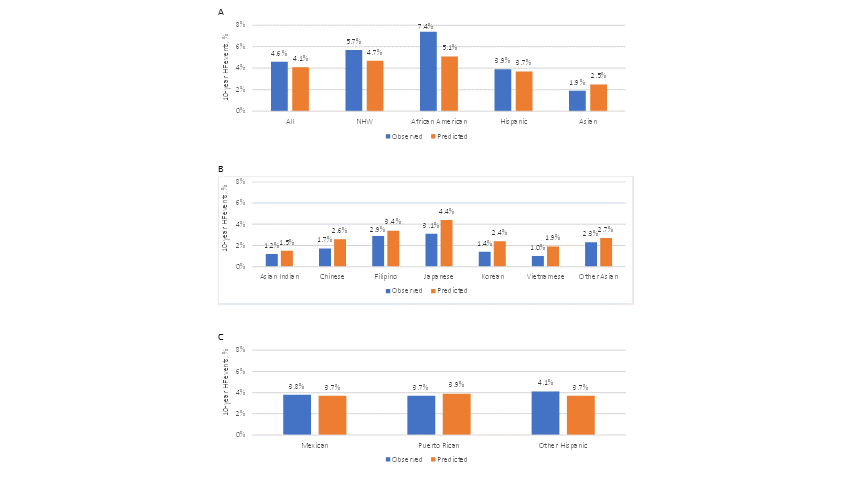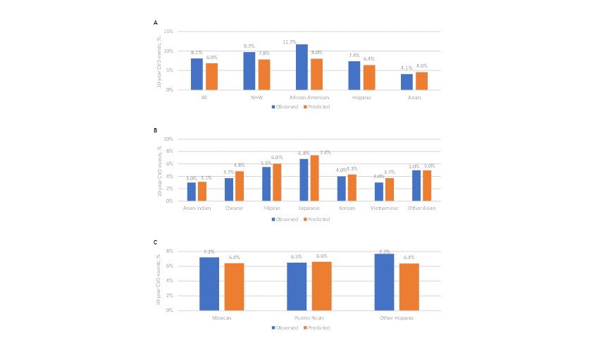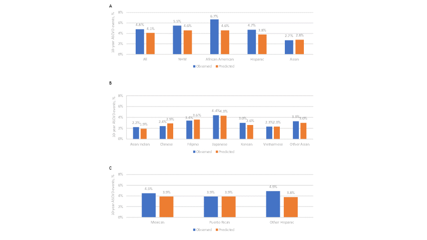 Abstract Body (Do not enter title and authors here): Background New race-free Predicting Risk of Cardiovascular disease (CVD) EVENT models (PREVENT) by AHA predict 10-year total CVD, ASCVD, and heart failure (HF), respectively. Although model discrimination and calibration was generally good among Non-Hispanic White and Black, their performance among Asian and Hispanic groups, particularly in disaggregated subgroups, remain unknown. Objectives We assessed PREVENT model performance in a diverse population with more than 10-year follow-up electronic health records (EHR) data in different race/ethnic groups and in disaggregated Asian and Hispanic subgroups. Methods Using retrospective primary care cohort who had no baseline CVD and with at least 10-year follow-up EHR data, we estimated Harrel’s C-statistics for each PREVENT submodel and by race/ethnicity. Predicted risk based on PREVENT models verse observed corresponding CVD event risk were compared in each race/ethnicity group and Asian/Hispanic subgroups. Results Over 191,000 primary care patients were identified and met the study criteria, with 58.5% non-Hispanic white (NHW), 3.2% non-Hispanic Black (NHB), 21.4% non-Hispanic Asian (NHA) and 10% Hispanic. Across three PREVENT sub-models, model performance in discriminating corresponding CVD event was comparable with those in the original model development and validation cohort, with best performed on NHA (C-statistics>0.80) for all three models, poorest on NHB (C-statistics ranges 0.75-0.77). However, each model underestimated the risk for overall population, with most underestimated for NHB, but overestimated for NHA. Within NHA, total CVD model performed best in Asian Indian and Vietnamese (C-statistics: 0.88) and poorest on Japanese (C-statistics =0.78), ASCVD model performed best on female Vietnamese (C-statistics=0.86) and worst on female Korean (c-statistics=0.72), while HF model performed well for Asian Indian and Korean. However, total CVD model and ASCVD overestimated most for Chinese, HF overestimated most on Vietnamese (Figure 1,2,3). Within Hispanic, the models performed best in Puerto Rican. Conclusions: PREVENT models had significantly improved the discrimination performance in all race/ethnicity groups and disaggregated Asian and Hispanic subgroups. However, all three models underestimate risk for all groups except NHA. The variation emphasizes the importance in recognizing heterogeneity within population, individual risk should always be considered in using risk model in clinical practice.