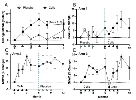 Abstract Body (Do not enter title and authors here): In pulmonary arterial hypertension (PAH), widespread pruning of the lung distal arterial bed leads to increased vascular resistance, right heart failure and death. Currently, there are no available therapies designed to revascularize the lung. We assessed the effects of autologous, angiogenic endothelial progenitor cells (EPCs) transfected with endothelial NO synthase (eNOS) in PAH patients receiving available standard-of-care therapies in a 12-month randomized, controlled trial (RCT; NCT03001414). Patients were randomized to receive a course of 4 monthly infusions over the first 6 months consisting of placebo (Arm 1) or eNOS-EPCs (20M cells; Arms 2 and 3) at 0, 1, 2 and 3 months, for a total 80M cells. After 6 months, Arm 1 crossed over to cell infusions, Arm 2 to placebo, whereas Arm 3 received a second course of eNOS-EPCs (total 160M cells). The primary endpoint was change in 6MWD (baseline to 6 months) between patients receiving eNOS-EPCs vs. placebo. However, due to the COVID-19 pandemic the trial was stopped after only 12 of the planned 45 patients were enrolled (5 placebo, 7 cells). While small sample size precluded appropriately powered analyses, a qualitative difference was seen between the eNOS-EPC and placebo groups over the first 6 months (Figure), with a 2-fold greater proportion of patients achieving a 35-meter increase in 6MWD in the cell therapy group (40% vs. 20%, resp). As well, these improvements coincided with cell delivery in all 3 Arms, with a sustained increase in 6MWD over 12 months after a single course of cells in the first 6 months (Arm 2). Treatment with eNOS-EPCs was well tolerated; however, an isolated decrease in 6MWD was apparent 1 month after the first infusion of the second course of cell therapy in Arm 3 patients, with full recovery by the end of the course. This raises the possibility of an immune response to rechallenging patients with this autologous cell product, despite the absence of any clinical indicators, which will be explored by analysis of immune biomarkers. Therefore, the results of the SAPPHIRE trial suggest possible clinical benefit of a single course of 4 infusions of eNOS-EPCs in PAH patients receiving cell therapy and support the performance of a larger RCT.