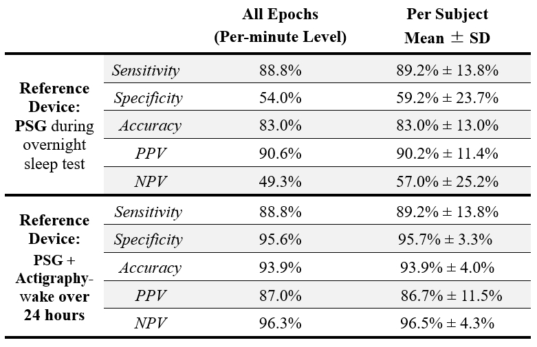 Abstract Body (Do not enter title and authors here): Background Ambulatory ECG (AECG) enables heart rhythm monitoring during daily activities, with a focus on arrythmia detection. Detection and quantification of sleep and activity patterns during monitoring may provide insights into lifestyle and aid in contextualizing arrhythmia events. Aims We developed an AI algorithm to classify sleep, activity, and inactivity periods using a novel AECG patch with embedded accelerometry. We assessed algorithm performance and compared it to FDA-cleared actigraphy and consumer devices, which have shown 93-99% sensitivity (SE) and 39-54% specificity (SP) in classifying sleep vs. polysomnography (PSG). Methods We conducted a prospective study of 81 participants at 3 sites who wore the Zio® monitor AECG patch (iRhythm Technologies, San Francisco, CA) and Actigraph wGT3X (Pensacola, FL) simultaneously for 14 days. Sleep disordered breathing was excluded. Participants underwent a 6-minute walk test at the beginning of wear and in-clinic overnight PSG sleep testing at 7±3 days. Data were split into training (n=40) and validation (n=41) sets. Feature and model selection utilized five-fold cross-validation on the training set, focusing on total activity and body angle. The final machine model was trained on selected features using the entire training set. In validation, SE and SP for sleep were assessed based on 1-minute epochs vs. PSG and also vs. a 24-hour reference (combined PSG and actigraphy-wake labeling). SE and SP for activity were assessed vs. actigraphy over 8 minutes sampled per subject (4min walk test, 4min PSG wake periods). Results The study population was diverse (age 43±14 years, 57% female, 64% White, 25% Black, 20% Hispanic). In the validation set, average sleep and wake times were 5.9 and 1.2 hours, respectively, during PSG. SE and SP were 88.8% and 54.0%, respectively, in sleep detection vs. PSG, or 88.8% SE and 95.6% SP vs. the 24-hour reference (Table 1). SE and SP for activity detection were 97.0% and 100%, respectively. Conclusion Assessment of sleep and activity during AECG is feasible, with performance comparable to FDA-cleared actigraphy. This feature offers insights into patient wellness patterns, highlighting its potential for personalized healthcare monitoring.