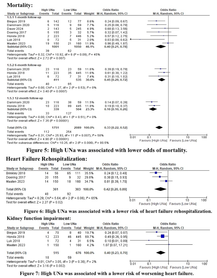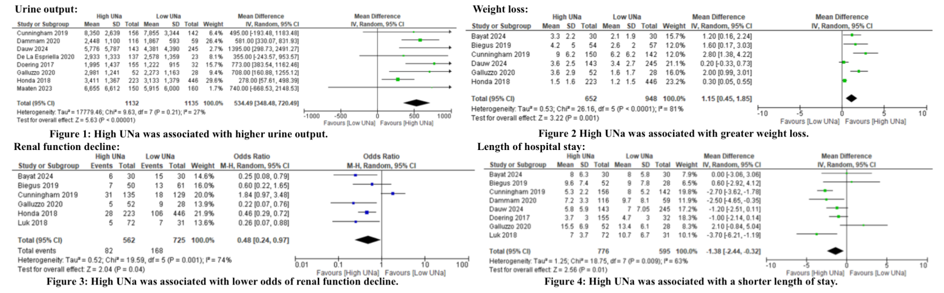 Abstract Body (Do not enter title and authors here): Introduction: The measurement of Urinary Sodium Concentration (UNa) is a pivotal biomarker in managing Acute Heart Failure (AHF), offering a non-invasive and readily accessible means to evaluate diuretic response. This systematic review and meta-analysis is designed to investigate the correlation between UNa levels and patient-centric outcomes in AHF, aiming to validate the evidence base and refine clinical practice. Methods: This systematic review and meta-analysis were conducted in accordance with PRISMA guidelines. We systematically searched PubMed, Cochrane Central, Scopus, Google Scholar, and ClinicalTrials.gov from their inception to May 2024. Our search included randomized controlled trials (RCTs) and observational studies comparing outcomes between acute heart failure (AHF) patients with high urinary sodium concentration (UNa) and those with low UNa. Results: The analysis included 12 studies comprising 5 RCTs and 7 observational studies, incorporating a total of 8,743 AHF patients. In the high UNa group, pooled data demonstrated significantly higher urinary output (MD 534.49 ml, 95% CI 348.48 to 720.49; P < 0.00001) and increased weight loss (MD 1.15 kg, 95% CI 0.45 to 1.85; P < 0.001). Additionally, there was a lower risk of renal function decline (OR 0.48, 95% CI 0.24 to 0.97; P < 0.04). Patients with high urinary sodium had a shorter mean hospital stay of 7.6 days compared to 8.8 days for those with low UNa, with an overall reduction in length of stay (MD -1.38 days, 95% CI -2.44 to -0.32; P < 0.01). Mortality was also lower in the high UNa group, particularly over longer follow-up periods: at 1-month follow-up (OR 0.40, 95% CI 0.21 to 0.78; P = 0.007), at 6-month follow-up (OR 0.45, 95% CI 0.29 to 0.72; P = 0.0007), and at 12-month follow-up (OR 0.16, 95% CI 0.16 to 0.26; P < 0.00001). Furthermore, the high UNa group exhibited a lower risk of worsening heart failure requiring inotropes (OR 0.40, 95% CI 0.23 to 0.70; P = 0.002) and a reduced incidence of heart failure rehospitalization (OR 0.42, 95% CI 0.20 to 0.89; P = 0.02). Conclusion: High urinary sodium concentration is strongly associated with improved clinical outcomes in acute heart failure, including greater urinary output, increased weight loss, shorter hospital stays, and reduced risks of renal function decline, mortality, worsening heart failure, and rehospitalization.