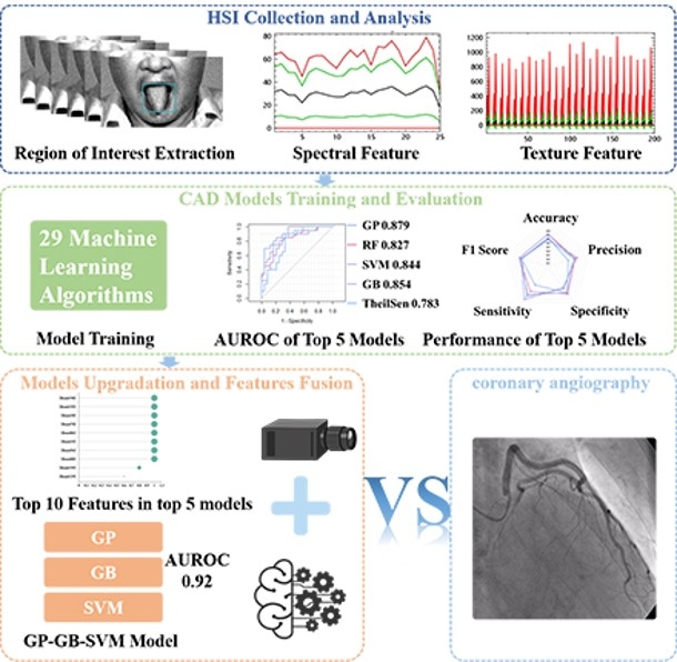 Abstract Body (Do not enter title and authors here): Background Hyperspectral imaging (HSI) can be used for high-precision classification, offering high spectral resolution, wide spectral coverage, and high data dimensionality. Patients with coronary artery disease (CAD) possess distinctive body surface image characteristics. However, value of HSI for the diagnosis of CAD remains unclear Hypothesis CAD patients exhibit characteristic spectral signatures on surface, which can be used for diagnostic identification of CAD. Methods This is a cross-sectional observational study. Clinical baseline characteristics, results of coronary artery angiography (CAG) and tongue dorsum hyperspectral images (spectral range:688-951nm) were collected from the subjects. In this study, 3650 hyperspectral images were included. These images are divided into training sets(N=2555) and validation sets(N=1095). Machine learning algorithms were used to selection of features in hyperspectral images and construction of CAD diagnosis models (including Gaussian process (GP), random forest (RF), support vector machine (SVM), gradient boosting (GB), TheilSen etc). Model fusion was achieved by forward selection strategies to improve model performance. The screened features are further used to generate new clinical markers through band math. Predictive performance of the models was assessed based on the results from CAG. Results The model performance was evaluated through area under receiver operating characteristics (AUROC), decision curve analysis (DCA), calibration curve, accuracy, precision, sensitivity, specificity, and F1 score. (1) The top 5 performance models were selected from 29 models, including GP, RF, SVM, GB, and TheilSen. The corresponding AUROC for top 5 models were 0.879, 0.827, 0.844, 0.854 and 0.783.(2) Based on forward selection strategy, GP, GB and SVM models were selected to develop fusion model (GP-GB-SVM model). Model performance of GP-GB-SVM model was upgraded and AUROC of GP-GB-SVM was 0.92. (3) The top 10 features were recognized from top 5 models. Combination of 10 features through band math generated new clinical marker (Hyper-CAD), which can effectively predict risk of CAD. Conclusion The present study suggests that patients with CAD exhibit characteristic HSI alterations on the surface. Patients with CAD can be effectively diagnosed and identified based on these alterations.