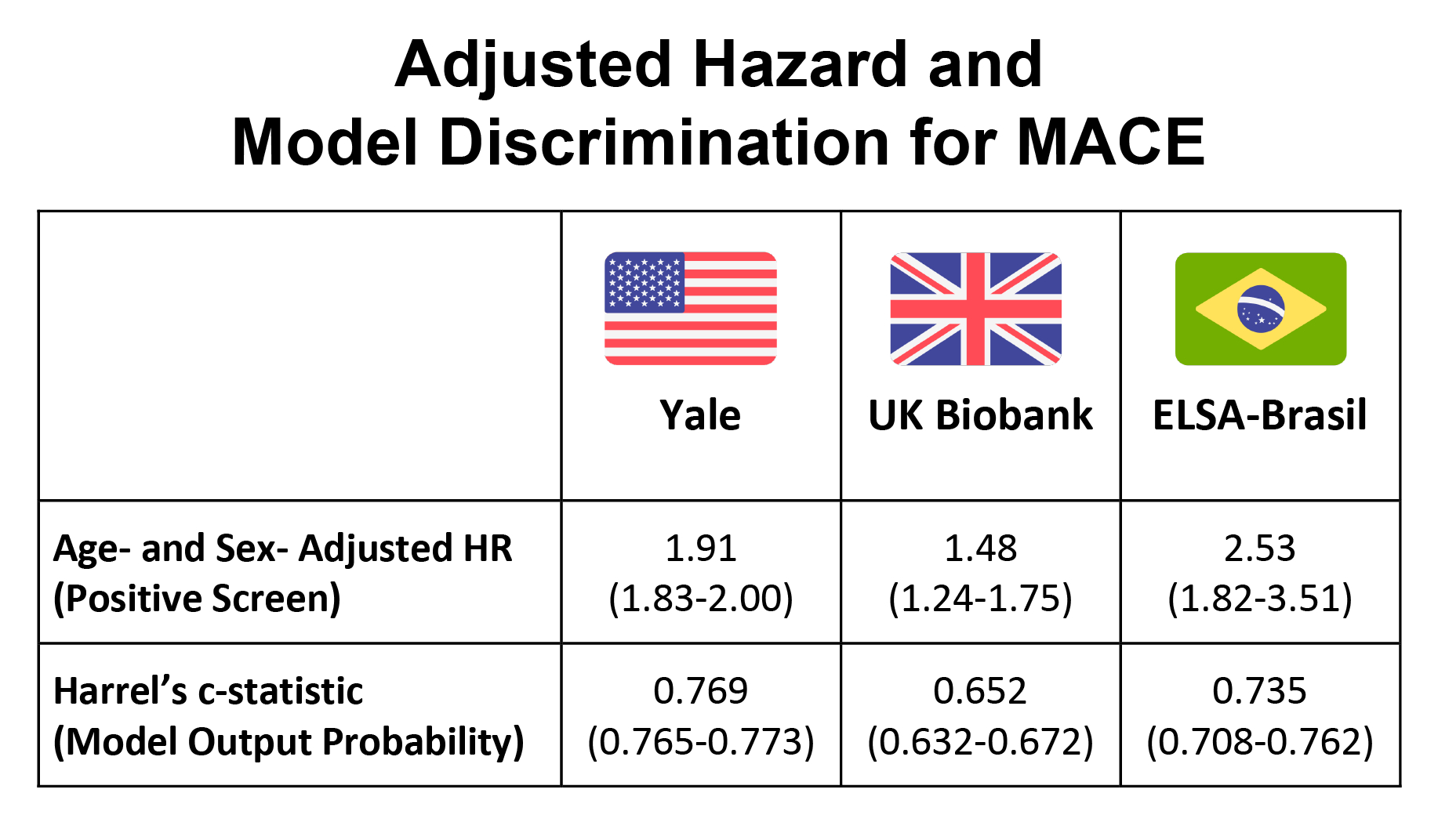 Results: There were 169,381 patients with outpatient ECGs at YNHHS (age 55 years [IQR, 40-68], 98023 women [58%]), 42,741 UKB participants (65 years [59-71], 21,795 women [52%]), and 13,454 ELSA-Brasil participants (56 years [41-69], 7,348 women [55%]) with baseline ECGs. A total of 12,483 patients had MACE and 8595 developed SHD in YNHHS over 4.5 years (2.6-6.6). In UKB and ELSA-Brasil, 768 and 388 participants had MACE over 3.1 years (2.1-4.5) and 4.2 years (3.7-4.5), respectively. Each 0.1 increment in the model output portended a 15-35% higher hazard of MACE across cohorts, independent of age, sex, and comorbidities (aHR: YNHHS 1.20 [1.19-1.21], UKB 1.15 [1.09-1.20], ELSA-Brasil 1.35 [1.28-1.44]). Among patients with serial echocardiograms in YNHHS, a positive AI-ECG screen portended a 2-fold higher risk of new-onset SHD (aHR: 2.09 [1.98-2.20]).