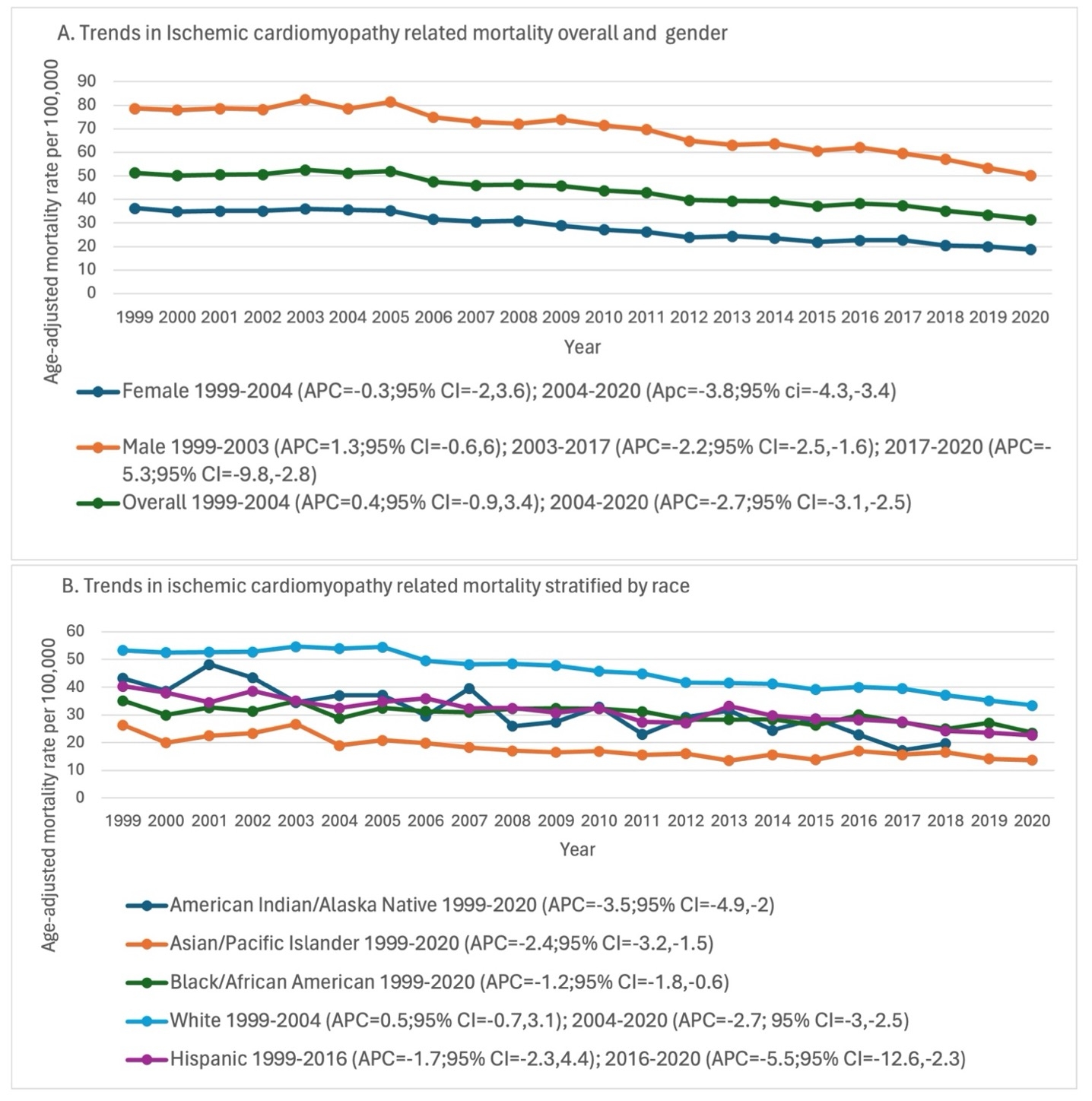 Abstract Body (Do not enter title and authors here): Introduction Ischemic cardiomyopathy (IC) is a significant contributor to cardiovascular mortality, especially among older adults in the United States. Understanding mortality trends related to IC can help identify at-risk populations and make informed targeted healthcare strategies. This study investigates IC-related mortality trends and disparities among older adults aged ≥75 years in the US population. Methods The CDC Wide-ranging Online Data for Epidemiologic Research (CDC WONDER) was used to analyze the National Vital Statistics System data from 1999 to 2020. Deaths with IC as the primary cause of mortality were identified, and results were presented as age-adjusted mortality rates (AAMR) per 100,000 population. Joinpoint regression was used to assess changes in trends and annual percentage change (APC). Results A total of 186,136 deaths occurred in patients with IC from 1999 to 2020 (AAMR = 42.9, 95% CI: 42.7 - 43.2). Males had higher mortality rates (AAMR = 67.8) compared to females (AAMR = 27.7). Non-Hispanic Whites (NHW) had the highest AAMR (45.2, 95% CI: 45-45.4), followed by Hispanics (29.8, 95% CI: 29.1-30.5), non-Hispanic Blacks (NHB) (29.6, 95% CI: 29-30.1), non-Hispanic American Indian/Alaska Native (NH-AIAN) (29.1, 95% CI: 26.8-31.3). Non-Hispanic Asian/Pacific Islanders (NH-API) had the lowest AAMR (16.9, 95% CI: 16.2-17.6). Regionally, the South had the highest mortality rates (47.8, 95% CI: 47.5-48.2), followed by the Midwest (47.4, 95% CI: 46.9-47.8), the West (36.7, 95% CI: 36.3-37.1), and the Northeast (36.3, 95% CI: 35.9-36.7). Mortality rates were higher in rural areas (44.1, 95% CI: 43.5-44.7) compared to urban areas (36.5, 95% CI: 36.1-36.8). Overall, the AAMR increased from 51.3 in 1999 to 51.9 in 2005, followed by a decline to 31.5 in 2020 (APC: -2.0, 95% CI: -2.2, -1.7). Noteworthy declines in AAMR were observed in both men (APC: -2.0) and women (APC: -2.9) throughout the study (Figure, Panel A). Moreover, significant downward trends were evident in NH-AIAN (APC: -3.5), NHB (APC: -1.2), NHW (APC: -2.7 since 2004), Hispanics (APC: -5.5 since 2016), and NH-API (APC: -2.4) racial groups (Figure, Panel B). Conclusion Our study reveals disparities in IC-related mortality, highlighting males, NHW, and the residents in the South and Midwest as well as those living in rural areas are at increased risk. Targeted interventions and resource allocation are essential to improve outcomes for vulnerable populations.