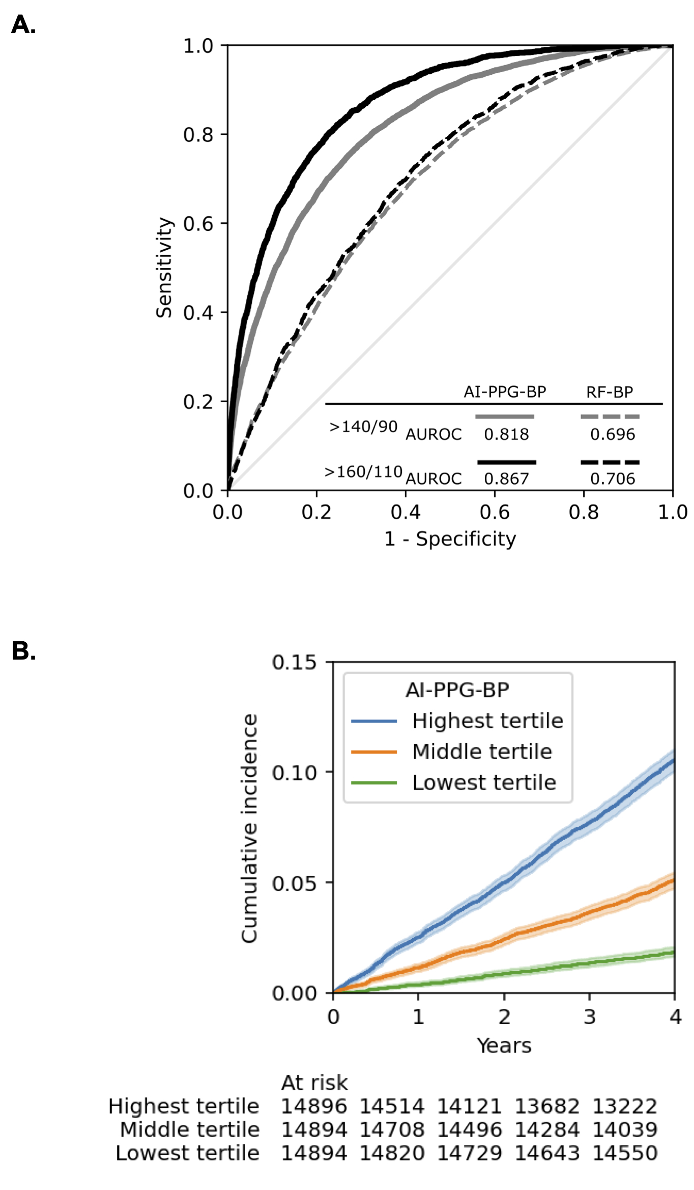 Conclusion: A deep learning model, AI-PPG-BP, may be able to serve as a useful pre-screener by helping to detect elevated BP and stratifying risk of near-term, incident HTN using finger PPG.