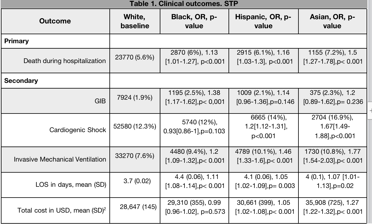 Methods we examined the national inpatient sample 2017-2020 for adult admitted with st segment myocardial infarction,we compared the clincal outcome of patients admitted with stemi with pci based on racial distribution.STATA 18th edition was used for analyses. Age, gender, race, hypertension, diabetes, obesity, dyslipidemia, and Elixhauser comorbidity index were identified as confounders by univariate analyses and tested further with multivariate logistic regression models. The primary outcome was mortality. Secondary outcomes were the need for intubation, cardiac arrest, length of stay (LOS), and total hospital charges.