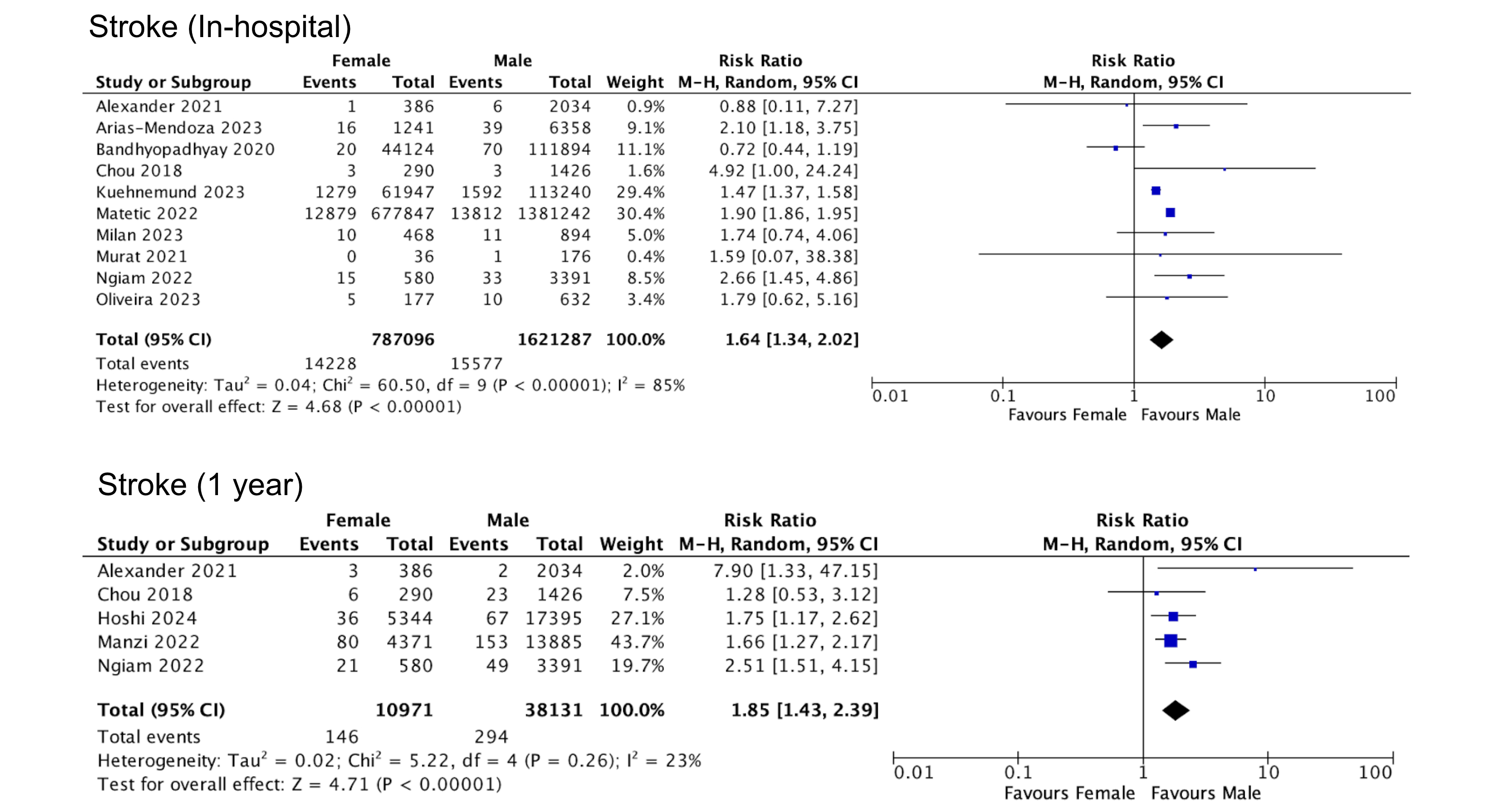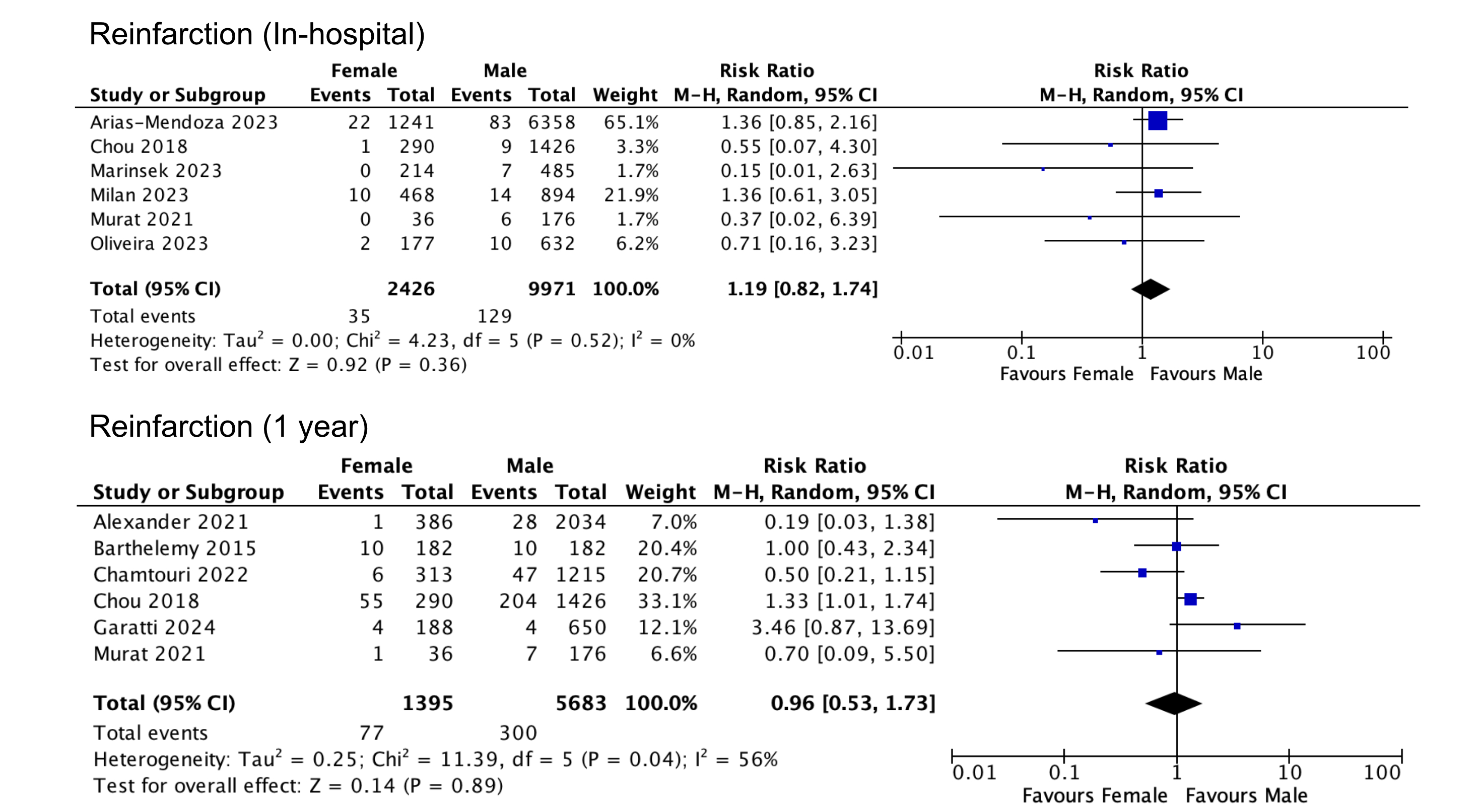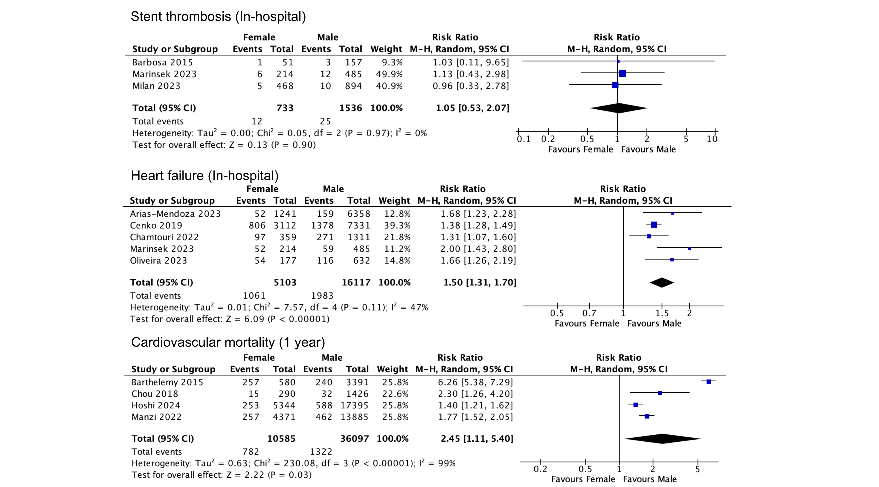 Abstract Body (Do not enter title and authors here): Background Over the past decade, research has focused on gender disparities in cardiovascular outcomes. Historically, women have had higher mortality rates and worse outcomes after STEMI compared to men. This study aims to investigate if advancements in interventional cardiology and pre-hospital and in-hospital care have improved outcomes for women over 10 years. Methods PubMed, Scopus and Cochrane were reviewed for cohort studies and registries from 2014-2024 comparing male and female STEMI patients, focusing on mortality, reinfarction, heart failure, stroke, and stent thrombosis. In-hospital and 1-year outcomes were assessed. Statistical analysis used Review Manager and I^2 for heterogeneity with a random-effects model. Results We found 28 studies from 39 countries, with 39% female participants. T2DM was prevalent for 33.2% of males and 36.9% of females, with 32.2% of males and 21.3% of females being smokers. Both genders had an equal history (50%) of previous MI, PCI, and CABG. Primary PCI was performed in a majority (73%) of male patients compared to 62% of female patients; while thrombolysis was received by 73.1% of males and 61.5% of females. For in-hospital outcomes, women have a higher all-cause mortality risk (RR = 1.77, 95% CI: 1.65-1.91), consistent in 2014-2018 (RR = 1.75, 95% CI: 1.49-2.05) and 2019-2024 (RR = 1.79, 95% CI: 1.63-1.96; P = 0.81) Women have higher risks of stroke (RR = 1.64, 95% CI: 1.34-2.02) and heart failure (RR = 1.50, 95% CI: 1.31-1.70) No significant differences were found in reinfarction (RR = 1.19, 95% CI: 0.82-1.74) or stent thrombosis (RR = 1.05, 95% CI: 0.53-2.07) At 1 year, women have a significantly higher all-cause mortality risk (RR = 1.94, 95% CI: 1.48-2.53), observed in both 2014-2018 (RR = 1.77, 95% CI: 1.26-2.50) and 2019-2024 (RR = 1.98, 95% CI: 1.45-2.72; P = 0.64) Women also face higher cardiovascular mortality (RR = 2.45, 95% CI: 1.11-5.40) and stroke risk, (RR = 1.85, 95% CI: 1.43-2.39) with no significant difference in reinfarction risk (RR = 0.96, 95% CI: 0.53-1.73) Conclusion Women with STEMI still face higher risks of in-hospital and 1-year all-cause mortality, stroke, and heart failure compared to men, indicating insufficient improvement in outcomes. There were no significant differences in reinfarction and stent thrombosis. It is important for future efforts to focus on understanding these disparities to improve outcomes for women.