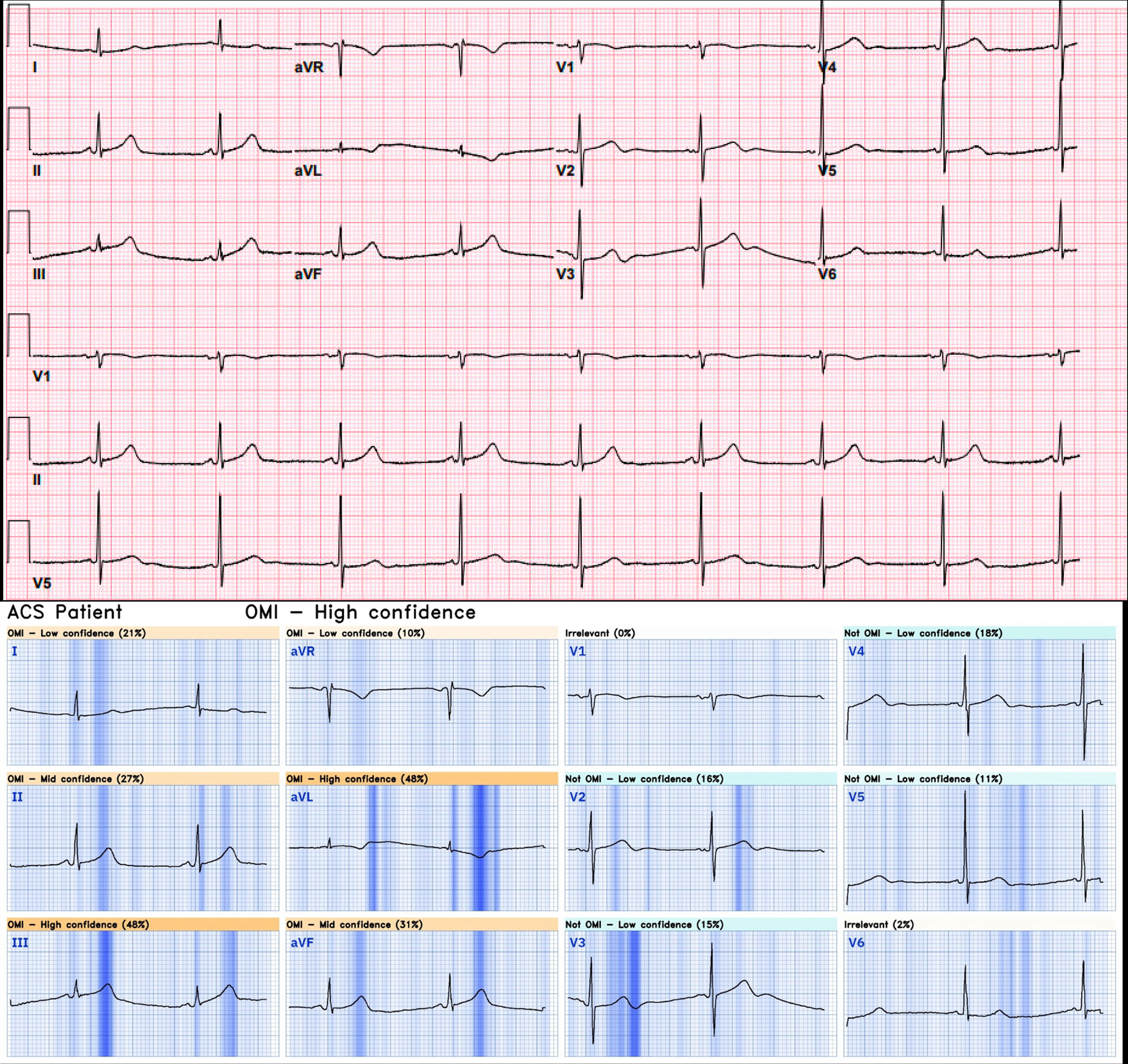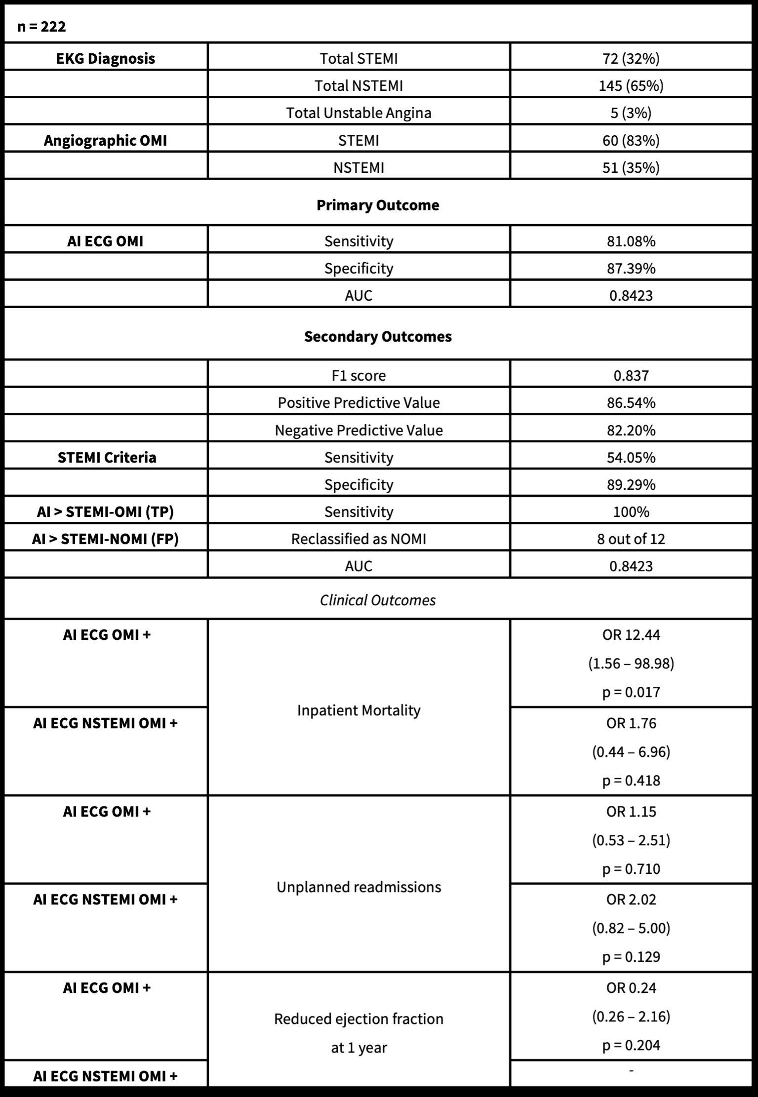 Results Of 257 patients, 222 met the inclusion criteria: 72 STEMI (32%), 145 NSTEMI (65%), and 5 unstable angina (3%). Confirmed angiographic OMI: 60 (83%) STEMI and 51 (35%) NSTEMI patients. AI model sensitivity was 81.08%, specificity 87.39%, AUROC 0.8423, F1 score 0.8372, PPV 86.54%, NPV 82.20%. Odds ratio of 12.44 (1.56 - 98.98) for AI-detected OMI patients, unplanned readmissions (OR 1.15 [0.53 - 2.51]), and reduced ejection fraction at 1 year (OR 0.24 [0.26 -2 .16]). Traditional STEMI criteria sensitivity for OMI was 54.05%, and specificity 89.29%. The AI model was 100% sensitive for STEMI-OMI and correctly reclassified 8 out of 12 false positive STEMI patients as NOMI.