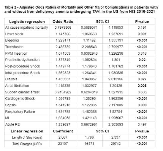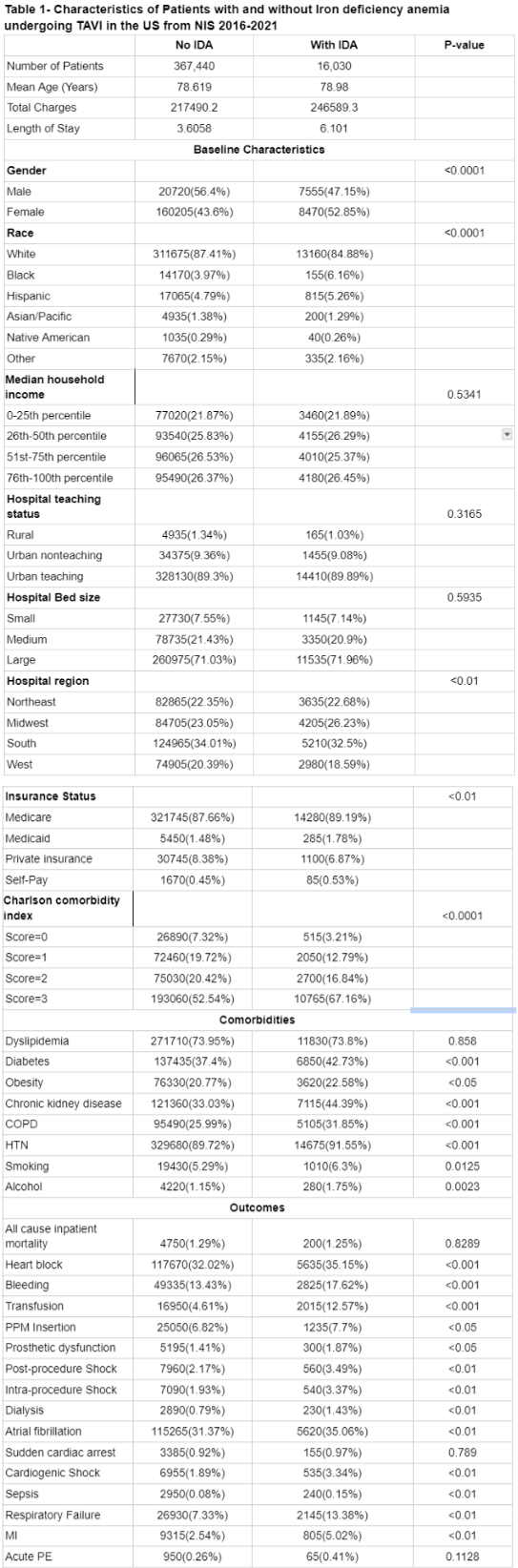 Abstract Body (Do not enter title and authors here): Background: Iron deficiency anemia (IDA) is a common comorbidity in patients undergoing Transcatheter Aortic Valve Implantation (TAVI). This study investigates the differences in outcomes between TAVI patients with and without IDA, focusing on mortality, procedural complications, and baseline characteristics. Methods: A retrospective analysis was conducted using data from the National Inpatient Sample (NIS) from 2016 to 2021. The outcomes for patients undergoing TAVI with IDA were compared to those without IDA. Multivariate logistic regression was employed to analyze outcomes. Results: The study included 367,440 patients without iron deficiency anemia and 16,030 patients with iron deficiency anemia. Baseline characteristics showed a significant difference in gender distribution, with 47.15% of IDA patients being male compared to 56.4% in the non-IDA group (P < 0.0001). Racial distribution varied significantly (P < 0.0001), with a higher % of Black patients in the IDA group (6.16% vs. 3.97%).Patients with IDA had higher odds of heart block (OR: 1.146, 95% CI: 1.061-1.238, P = 0.001), bleeding (OR: 1.229, 95% CI: 1.115-1.355, P < 0.001), transfusion (OR: 2.487, 95% CI: 2.209-2.800, P < 0.001), prosthetic dysfunction (OR: 1.377, 95% CI: 1.053-1.801, P = 0.02), post-procedure shock (OR: 1.450, 95% CI: 1.180-1.782, P < 0.001), intra-procedure shock (OR: 1.562, 95% CI: 1.264-1.931, P < 0.001), dialysis (OR: 1.450, 95% CI: 1.044-2.015, P = 0.027), atrial fibrillation (OR: 1.115, 95% CI: 1.033-1.204, P = 0.005), cardiogenic shock (OR: 1.587, 95% CI: 1.283-1.963, P < 0.001), sepsis (OR: 1.541, 95% CI: 1.122-2.117, P = 0.008), respiratory failure (OR: 1.635, 95% CI: 1.462-1.828, P < 0.001), and myocardial infarction (OR: 1.684, 95% CI: 1.421-1.996, P < 0.001). .Patients with IDA had a longer length of stay (Coefficient: 2.067, 95% CI: 1.798-2.337, P < 0.001) and higher total hospital charges (Coefficient: $23,107, 95% CI: $16,471-$29,742, P < 0.001) compared to those without IDA. Conclusions: Patients with IDA undergoing TAVI are at higher risk for several complications, including heart block, bleeding, transfusion, prosthetic dysfunction, post-procedure and intra-procedure shock, dialysis, atrial fibrillation, cardiogenic shock, sepsis, respiratory failure, and myocardial infarction compared to those without IDA. These findings underscore the need for targeted management strategies and further research to optimize outcomes for TAVI patients with iron deficiency anemia.