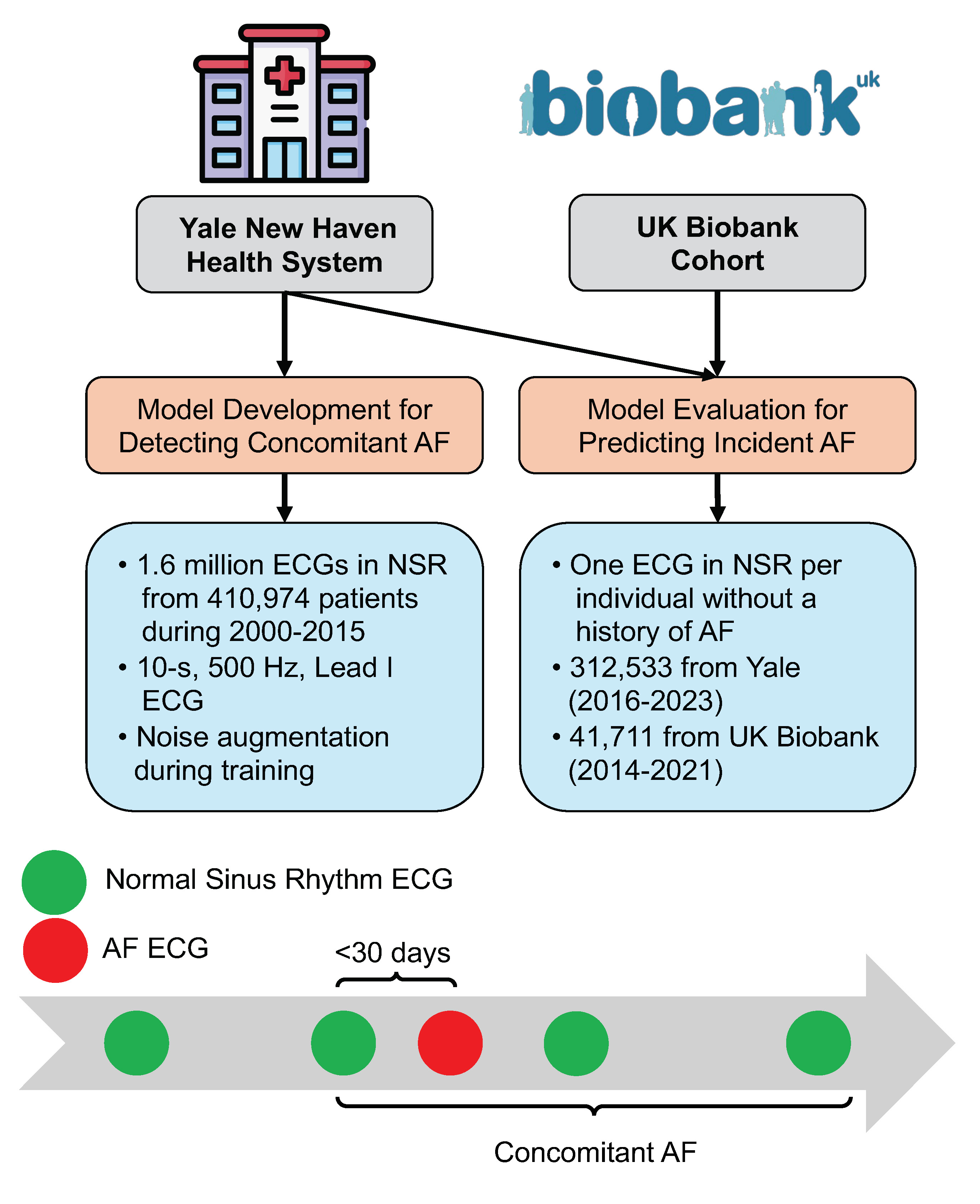 Abstract Body (Do not enter title and authors here): BACKGROUND: Portable ECG devices can help identify symptomatic atrial fibrillation/flutter (AF) episodes outside healthcare settings. However, most individuals remain undiagnosed due to the transient and often asymptomatic nature of AF. Here, we developed an AI-ECG model to detect concomitant paroxysmal AF and predict its future risk using lead I ECG recordings in normal sinus rhythm (NSR), with special adaptation for noisy acquisition on portable devices. METHODS: The model was developed using 1.6 million ECGs at Yale (2000-2015). ECGs in NSR associated with an ECG with AF rhythm from 30 days before to any time after were considered NSR with concomitant AF. A convolutional neural network was trained using lead I ECG to detect concomitant AF among NSR ECGs, augmented using random Gaussian noise during training to make them resilient to noisy acquisition on portable devices. We evaluated the model's probability as a predictor for incident AF (defined by AF ECGs or clinical diagnosis), in (1) a separate set of individuals in a temporally distinct population at Yale (2016-2023) and (2) the UK Biobank (UKB) (2014-2021), excluding those without a history of AF. We constructed age- and sex-adjusted Cox proportional hazards models with model probability as a key independent variable. RESULTS: The AI-ECG model achieved an AUROC of 0.821 (95% CI, 0.818-0.824) for detecting concomitant AF based on a single-lead ECG in NSR with a sensitivity of 75%, a specificity of 75%, a PPV of 28%, and an NPV of 96%. In the predictive assessment, 312,533 individuals (52 [IQR, 32-66] years, 54% women) at Yale, and 41,711 individuals (65 [59-71] years, 52% women) in UKB had no known AF. In these groups, 3.1% at Yale and 1.4% in UKB had incident AF over median follow-ups of 3.1 [1.6-4.5] years and 3.0 [2.1-4.5] years, respectively. AI-ECG had high discrimination for future AF risk (Harrell’s C-statistic, 0.77 in Yale and 0.68 in UKB). After accounting for age and sex, a positive AI-ECG was associated with a 2-fold higher hazard of AF (adjusted HR: 1.93 [1.84-2.02] in Yale and 2.34 [1.98-2.76] in UKB). CONCLUSION: We developed an AI-ECG model capable of detecting concomitant paroxysmal AF and predicting incident AF using a single-lead ECG noted to be in NSR. With the growing availability and accessibility of portable ECGs, this model enables a scalable screening and risk stratification strategy for AF, especially in older adults at increased risk of stroke, in the community.