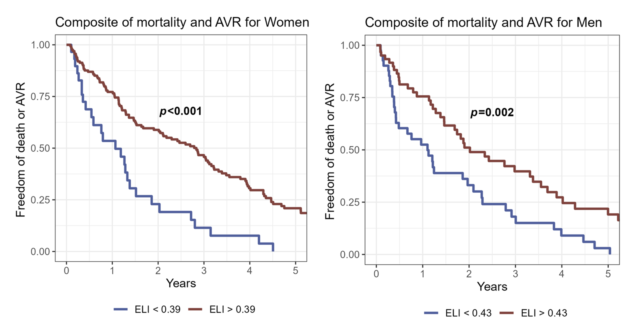 Results Optimal ELI thresholds were identified for men (0.43 cm2/m2, n=102) and women (0.39 cm2/m2, n=192). After adjusting for clinically relevant risk factors (age, LVEF, diabetes mellitus, hypertension), a lower ELI was independently associated with an increased composite outcome of mortality and need for aortic valve replacement for both women [HR 2.88 (95% CI 1.85-4.54), p<0.001] and men [HR 2.63 (95% CI 1.61-4.35), p<0.001], whereas the more commonly used threshold for ELI (0.6 cm2/m2) was not predictive.