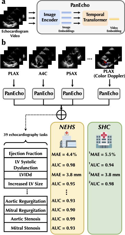 Methods: PanEcho was developed using 1.23 million echocardiographic videos from 33,927 TTE studies (mean age 67 years, 52.2% male) performed at a New England Health System (NEHS) from Jan 2016-Jun 2022. The model can perform 39 TTE reporting tasks, spanning the full spectrum of myocardial and valvular structure and function from any parasternal, apical, and subcostal views, including B-mode and color Doppler videos. It consists of an image encoder to learn spatial features, a Transformer for temporal modeling, and task-specific output heads; PanEcho was evaluated on a temporally distinct YNHHS cohort from Jul-Dec 2022 and two external California cohorts from 2008-2020 (Fig 1). We assessed both its off-the-shelf diagnostic performance and ability to function as a foundation model for fine-tuning in novel domains.