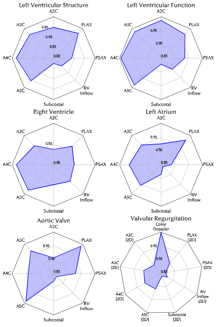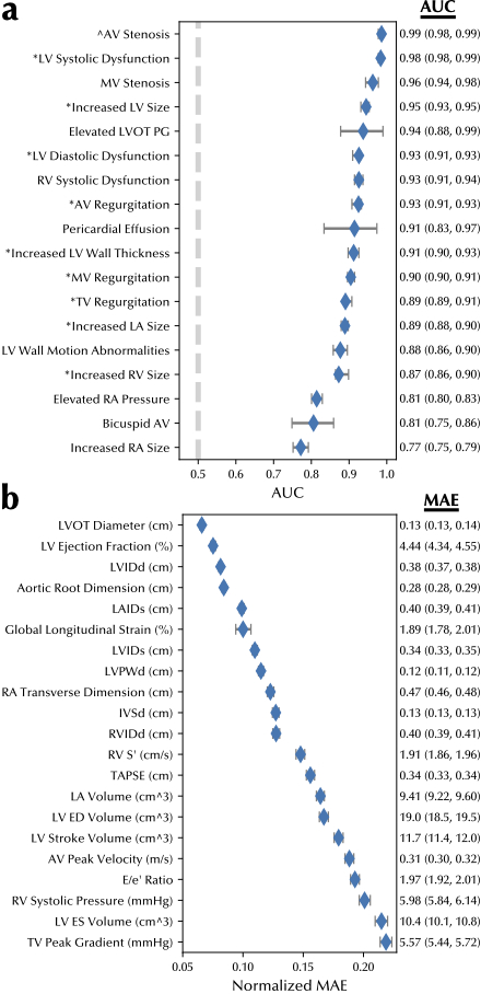 Results: PanEcho achieves a median area under the receiver operating characteristic curve (AUC) of 0.91 across 18 classification tasks, detecting severe aortic stenosis with 0.99 AUC, moderate-severe left ventricular (LV) systolic dysfunction with 0.98 AUC (0.94 AUC externally), moderate-severe LV dilation with 0.95 AUC (0.98 AUC externally), among others. (Fig 2A). The model estimates continuous metrics with a median normalized mean absolute error (MAE) of 0.13 across 21 tasks, e.g., defining LV ejection fraction (EF) with 4.4% MAE (5.5% MAE externally) and LV internal diameter with 3.8 mm MAE (Fig 2B). Multi-view evaluation confirms PanEcho’s ability to identify which views are most informative for each task (Fig 3). Further, the learned representations efficiently transfer to LVEF estimation in novel pediatric populations, outperforming existing approaches (3.9% MAE vs. next-best 4.5% MAE).