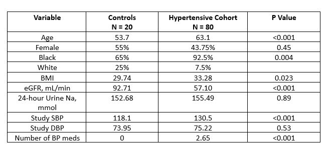 Abstract Body (Do not enter title and authors here): Introduction: Hypertension (HTN) remains poorly controlled at the population level. The kidney plays a prominent role in HTN, but the molecular mechanisms are unclear. We enrolled a cohort of patients with HTN, and controls, to study new molecular signatures in the transcriptome of cells shed in first morning urine samples. Methods: We collected demographics, 24-h and first-morning urine collections from 80 non-diabetic patients aged >40 with HTN and 20 controls (no HTN). Descriptive variables were summarized. Gene expression was assessed after Next Gen sequencing of mRNA obtained from cells pulled down from first-morning urine and assessed for differentially expressed genes (DEG) (<1 Log2 fold-, p<0.05 FDR) by the Wilcoxon Rank-Sum test. Pathway analysis for DEGs was performed with an in-house Python script that highlights genes associated with cardiovascular diseases including HTN, CKD, type 2 diabetes, inflammation, surface proteins (GPCR, transporters, etc), and the kinome. Results: Cohort characteristics are shown in Table 1. After QC, full transcriptomes were analyzed for 11 control and 34 HTN subjects. 20,800 transcripts were identified (including known genes, ORFs and LncRNAs) and compared between groups. 916 DEGs (FDR p<0.05) were identified: 911 genes up- and 5 down-regulated. In HTN subjects, there was overrepresentation of genes in inflammatory signaling pathways (12.5% of all DEGs) including those in IFN-alpha, IFN-gamma, Interleukin (IL)9, IL17 and IL18, and innate immunity. 15 genes, associated with HTN, and 45, associated with type-2 diabetes, at the genome-wide level were up-regulated in the HTN cohort including (LINC00592, ADRA1D, SLC39A12, WNT3A, RXFP2, DEFB136, PDE3A, OPRM1, RIBC2, GRIN2A, CHEK2, HOXA3, CCDC149, COL4A2). Transcripts for major apical nephron NaCl transporters were not significantly different, however, SLC12A5 (K/Cl cotransporter KCC2) and the voltage gated K channels (KCNE1, KCNE2) were up-regulated in HTN patients. Conclusions: We conclude that analysis of transcriptomes of cells shed in first morning urine of control and HTN patients allows for the identification of DEG. These data align well with our previous finding indicating that renal inflammation is associated with difficult-to-control hypertension, and as shown here, are also associated with HTN in general. This method allows for discovery of new inflammatory pathways that could render additional treatments for HTN or CKD.
