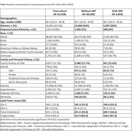 Abstract Body: Severe Hypercholesterolemia phenotype (SHP), defined as having low-density lipoprotein cholesterol (LDL-C) ≥190 mg/dL, is a strong predictor for atherosclerotic cardiovascular artery disease (ASCVD). People diagnosed with SHP are recommended to start taking statins, however there are still gaps and disparities in treatment. The purpose of this study is to characterize SHP patients and describe treatment patterns using real-world data from electronic health records (EHR) at a large academic health system. We conducted a retrospective cohort study using EHR data of individuals who had a clinical encounter at the University of Wisconsin Hospitals and Clinics between 01/01/2013 and 07/30/2023. The study was approved by the University of Wisconsin-Madison IRB. Participants aged 18–55 years with elevated total cholesterol (>200 mg/dL) or LDL-C (≥130 mg/dL) were eligible for this study. Cases of secondary hypercholesterolemia and participants receiving statins at enrollment were excluded. Statistical analysis was conducted using Pearson’s chi-square and Student t-test and counts (%) for categorical and median (interquartile range) for continuous variables are reported. All analyses were done using R (v. 4.3.1) analytical software. This study included 33,418 participants, of which 43% were women, 86% were White, and 95% were non-Hispanic/Latino. SHP was identified in 2,822 participants, who tended to be male (61% vs. 54%, P < 0.001), have a personal (2.1% vs. 1.6%, P=0.02) or family (15.6% vs. 11.7%, P < 0.001) history of coronary artery disease, and higher all-cause mortality (1.0% vs. 0.6%, P =0.03), compared to non-SHP cohort. Statin prescription was lower among patients who were younger (median age: 40 vs. 43 years) or Hispanic/Latino (4.6% vs. 2.9%, P = 0.023), with some differences (statistically non-significant) across races. We noted that patients prescribed statins were more likely to have comorbidities – ASCVD (12.2% vs. 3.3%, P < 0.001), hypertension (24.4% vs. 14.6%, P < 0.001), or diabetes (9.1% vs. 4.5%, P < 0.001), compared to their untreated counterparts. Current study revealed that statin prescription was correlated with age and presence of comorbidities. Our results suggest need for further investigation of institutional, clinician, and patient-related predictors and barriers for statin prescription, to improve compliance with clinical guidelines for prevention of ASCVD and other SHP-related diseases.