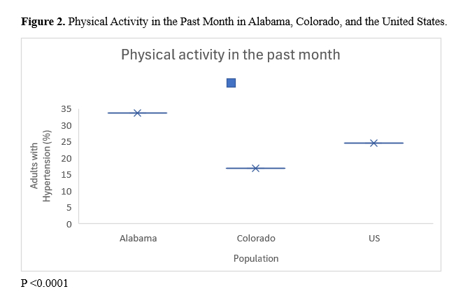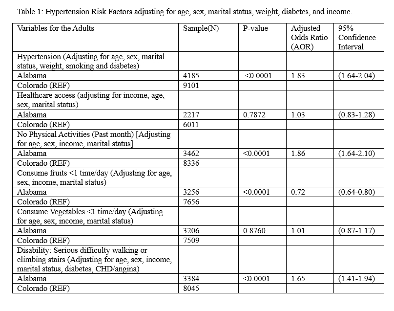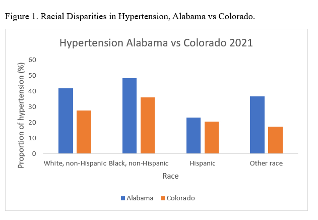 Abstract Body: Background: Hypertension is an important modifiable risk factor for cardiovascular disease, which disproportionately impacts racial/ethnic minorities in the US. Currently, Equity in Prevention of Hypertension (EPIPHANY, 2024) a program funded by the American Heart Association(AHA) is focusing on and engaging the Black belt of Alabama to mitigate hypertension by targeting adults with prehypertension, a new strategy to reduce the prevalence of hypertension. This project was meant to test the hypothesis of no difference in the risk of hypertension between two US States and to generate evidence for implementation. Objective: To compare the social determinant of health (SDOH), hypertension, and the AHA life's essential factors among adults in Colorado and Alabama in the 2021 Behavioral Risk Factor Surveillance System (BRFSS) Methodology: This was a cross-sectional survey of adults enrolled in the US 2021 BRFSS study. Data analysed compared Colorado and Alabama to determine the essential life factors among the two states. Elevated blood pressure (hypertension) and the included variables were based on the answers from the diagnosis of the healthcare professional given to the participants in the US BRFSS 2021. Data analysis used regression and risk ratios from the BRFSS WEAT to calculate the logistic regression and adjusted odds ratios (CDC, 2024). Results: In 2021, the racial proportion of adults with hypertension in Alabama was 41.8% for White vs 48.4% for the Black population (overall proportion=42.6 %), while in Colorado, 27.6% of White vs 36.1% of the Black adult population had hypertension(Overall proportion=25.9%) [Figure 1]. Compared to Colorado, AL has 1.83 times higher AOR of hypertension (p<0.0001). Fruit consumption, physical activity, and disability status significantly differed between Alabama and Colorado (p<0.0001)[Table 1, Figure 2]. Surprisingly, there was no difference in healthcare access between AL and CO (0.7872) [Table 1] Conclusion: Though Colorado has the lowest prevalence of hypertension in the United States, disparities still persist. However, Alabama demonstrated much higher disability status, lack of physical activity, and consumption of vegetables and fruits of <1 time/day (p<0.0001). Recommendations: The high burden of hypertension among ethnic minorities deserve attention and more evidence can be assessed to further understand the enabling factors that led to CO having the lowest proportion of hypertension.