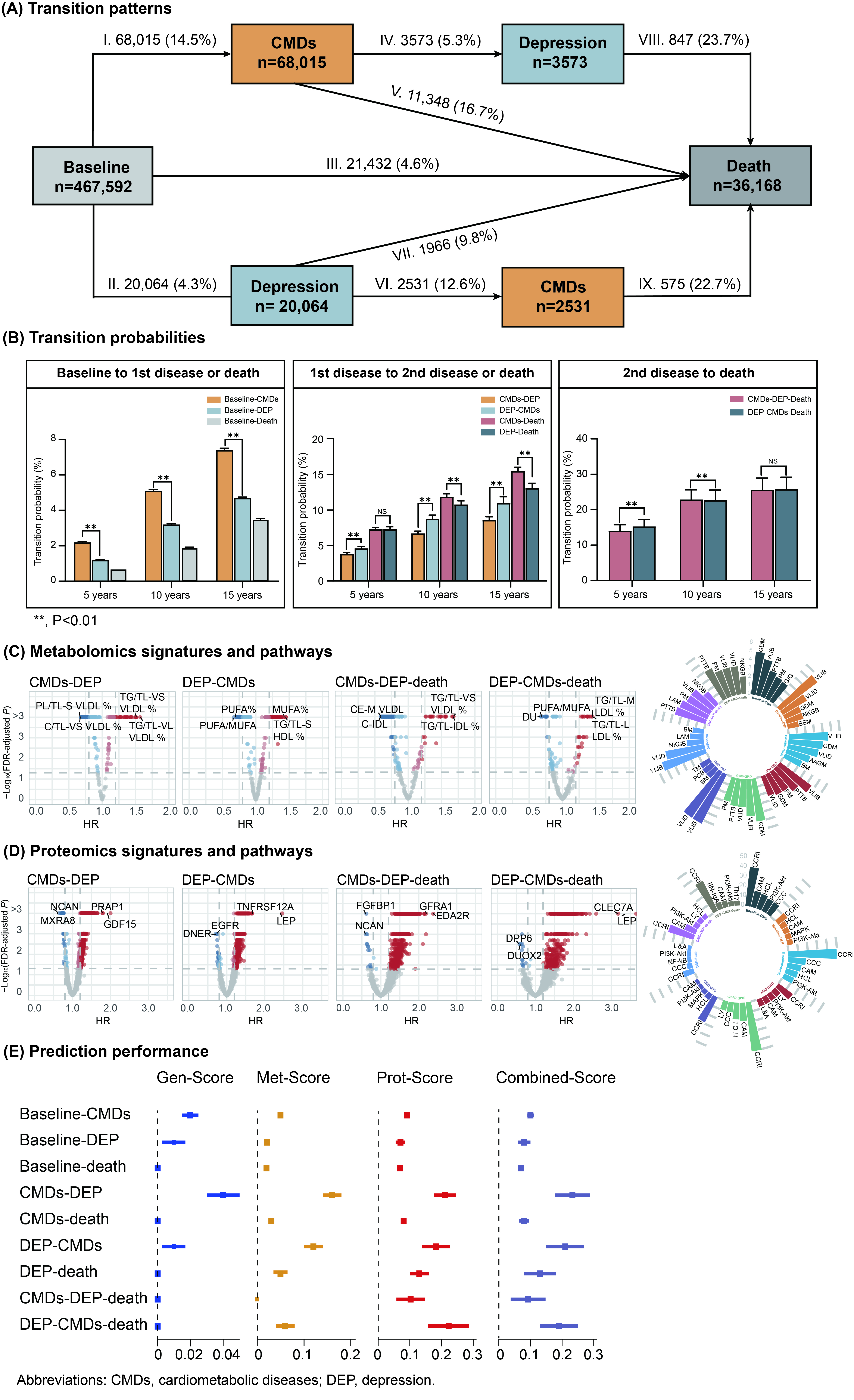 Conclusions This study revealed distinct transition patterns, identified associated multiomics signatures, and constructed multiomics prediction models for the multimorbidity cluster of CMDs and depression.