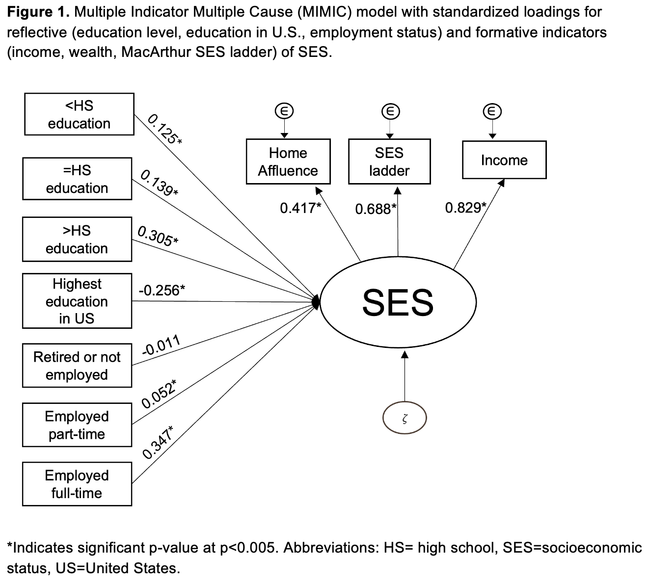 Abstract Body: Objectives: Low socioeconomic status (SES) is consistently associated with adverse cardiovascular health. Three key indicators are typically used as proxies for SES: income, education, and occupation. However, these indicators may not fully capture the unique sociodemographic features relevant to the SES of Hispanics/Latinos in the U.S. This study aims to expand the traditional SES model by identifying and incorporating additional features specific to Hispanic/Latino persons, providing a more comprehensive assessment of SES and its relationship with cardiovascular disease (CVD). Methods: The Hispanic Community Health Study/Study of Latinos (HCHS/SOL) is a community-based longitudinal cohort study of 16,415 adults self-identifying as Hispanic/Latino, enrolled from 2008-2011 from four U.S. urban communities. We utilized a multiple indicator multiple cause (MIMIC) model to identify formative and reflective indicators of a latent variable for SES. CVD was ascertained by self-report during the second in-person clinic examination from 2014-2017 (V2; N=11,623) and was defined as having had a heart attack, stroke, or angioplasty, stent, or bypass procedure. A survey logistic regression model was then used to examine the association of the latent SES with CVD at V2. Models were adjusted for age, sex, and study site. Results: Significant formative indicators of the SES latent variable included education level, whether the highest level of education was obtained in the US, employment status, and age at immigration (included in a second model with immigrants only; n=9,623). Significant reflective indicators of the SES latent variable included income, the MacArthur SES ladder, and affluence level. The measurement model demonstrated good fit to the data (RMSEA=0.016; CFI=0.984, SRMR=0.02). The SES latent variable was associated with CVD (OR=0.70, 95% CI 0.58, 0.84; for immigrants only OR=0.64, 95% CI 0.53-0.77). Conclusions: Incorporating indicators relevant to Hispanic/Latino populations provides a more comprehensive assessment of SES with potentially improved validity. The latent SES variable, including factors such as education location and age at immigration, was significantly associated with lower odds of cardiovascular disease. These findings highlight the importance of using a culturally-tailored SES framework when examining health outcomes in Hispanics/Latinos.