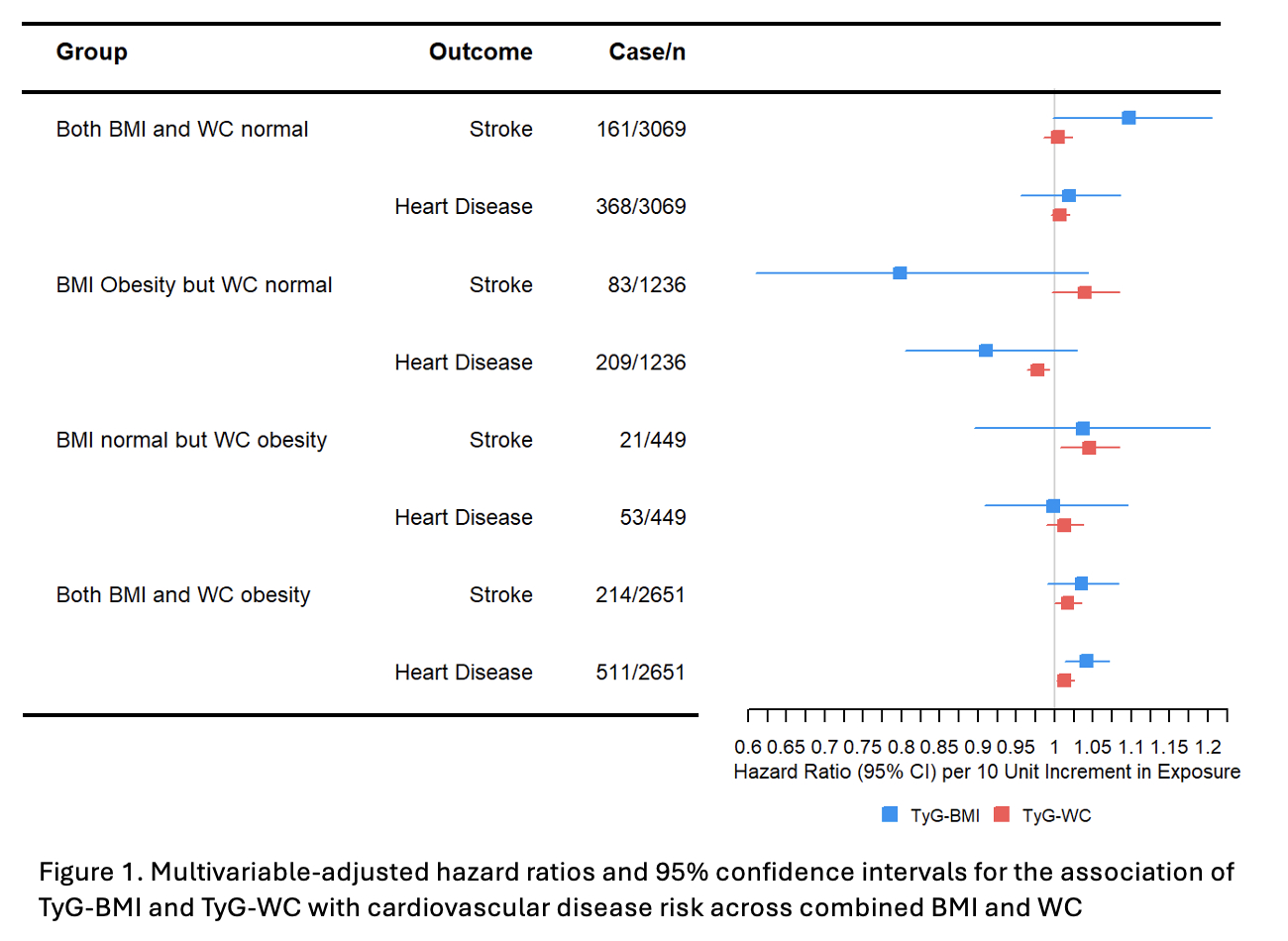Results Among 7,405 participants (mean age 57.8, 53.9% women), 479 stroke and 1141 heart disease incidents were recorded with average follow-up years of 6.55 and 6.35. The fully adjusted models in Figure 1 revealed that in the BMI and WC obesity group, every 10-unit increase in TyG-BMI and TyG-WC was associated with 4.2% and 1.3% higher risk of heart disease respectively (HR = 1.04, 95% CI = 1.01, 1.07; HR = 1.01, 95% CI = 1.002, 1.03). Additionally, among individuals with normal BMI but obese WC, each 10-unit rise in TyG-WC was associated with a 4.5% increase in stroke risk (HR = 1.05, 95% CI = 1.01, 1.08).