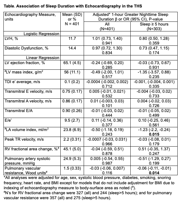 Abstract Body: Emerging evidence suggests a potential relationship between sleep and cardiac abnormalities, even in the absence of apnea. Therefore, we aimed to test the association of sleep duration and cardiac structure and function as assessed by echocardiography in African Caribbeans aged 50-80 years from the Tobago Heart Study (THS). Between 2021-2024, participants without history of heart failure underwent clinical examinations, 4 to 7-day actigraphy-based sleep assessment, and transthoracic echocardiography (preliminary analysis of 401 participants with all measures). Echocardiograms were analyzed by a central core lab with measures including left ventricular ejection fraction (EF), diastolic function, and left ventricular hypertrophy (LVH), among other indices. Statistical analyses tested the association of 24-hour sleep duration or nighttime sleep (between 8PM-8AM) with echocardiographic parameters adjusted for age, sex, BMI, systolic blood pressure, diabetes, smoking, snoring frequency, and heart rate using linear or logistic regression, as appropriate. The cohort was middle-aged (mean 60 years), predominantly female (89%), hypertensive (73%), and obese (median BMI 31 kg/m2). Mean 24-hr sleep duration was 5.8 hours (range=2-9 hours, median=5.5 hours), with a mean nighttime sleep duration of 5.5 hours. In adjusted models, longer nighttime sleep duration was not associated with echocardiography indices. However, when limited to just individuals who slept at least 5 hours at night, a 1-hour greater nighttime sleep duration was associated with ~5% lower left atrial volume index and ~5% lower pulmonary vascular resistance (P=0.01 for both). In contrast, nighttime sleep duration was not associated with left ventricular EF (b = -0.03 (-0.73 to 0.67), P=0.93). Results were similar when testing 24-hour sleep duration. Overall, among African Caribbean adults who sleep more than 5 hours per night, greater sleep duration may be associated with less risk of atrial fibrillation or pulmonary hypertension. This may be particularly relevant given that the African Caribbean population is at high risk for both hypertensive-related cardiac abnormalities and short sleep duration.