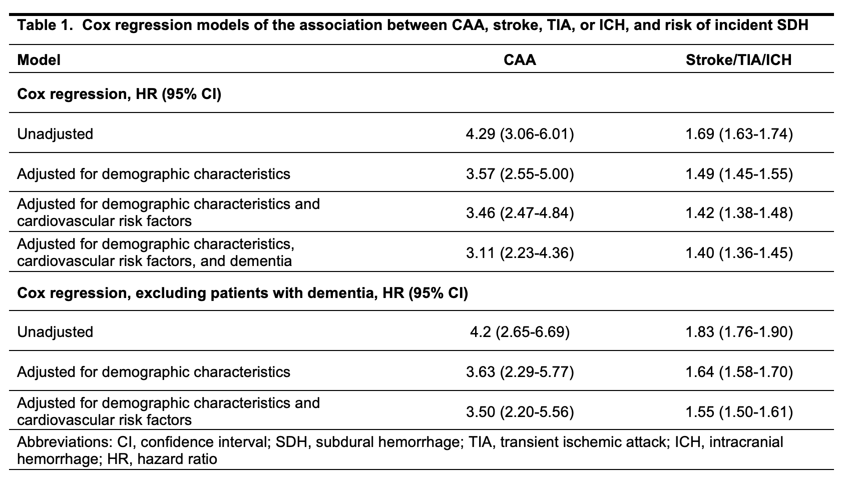 Results: Among 8.5 million hospitalized patients, 2,335 had CAA and 600,646 had other cerebrovascular disease. During a median follow up of 2.0 years (IQR, 1.0-3.9), incident SDH occurred in 34 (1.5%) patients with CAA, 3,552 with other cerebrovascular disease (0.6%), and 35,425 (0.4%) without CAA or other cerebrovascular disease. In adjusted Cox regression analysis, there was an increased risk of incident SDH seen for CAA (HR, 3.1; CI, 2.2-4.4) and prevalent cerebrovascular disease (HR, 1.4; CI, 1.3-1.5). Findings were similar in sensitivity analyses excluding patients with dementia.