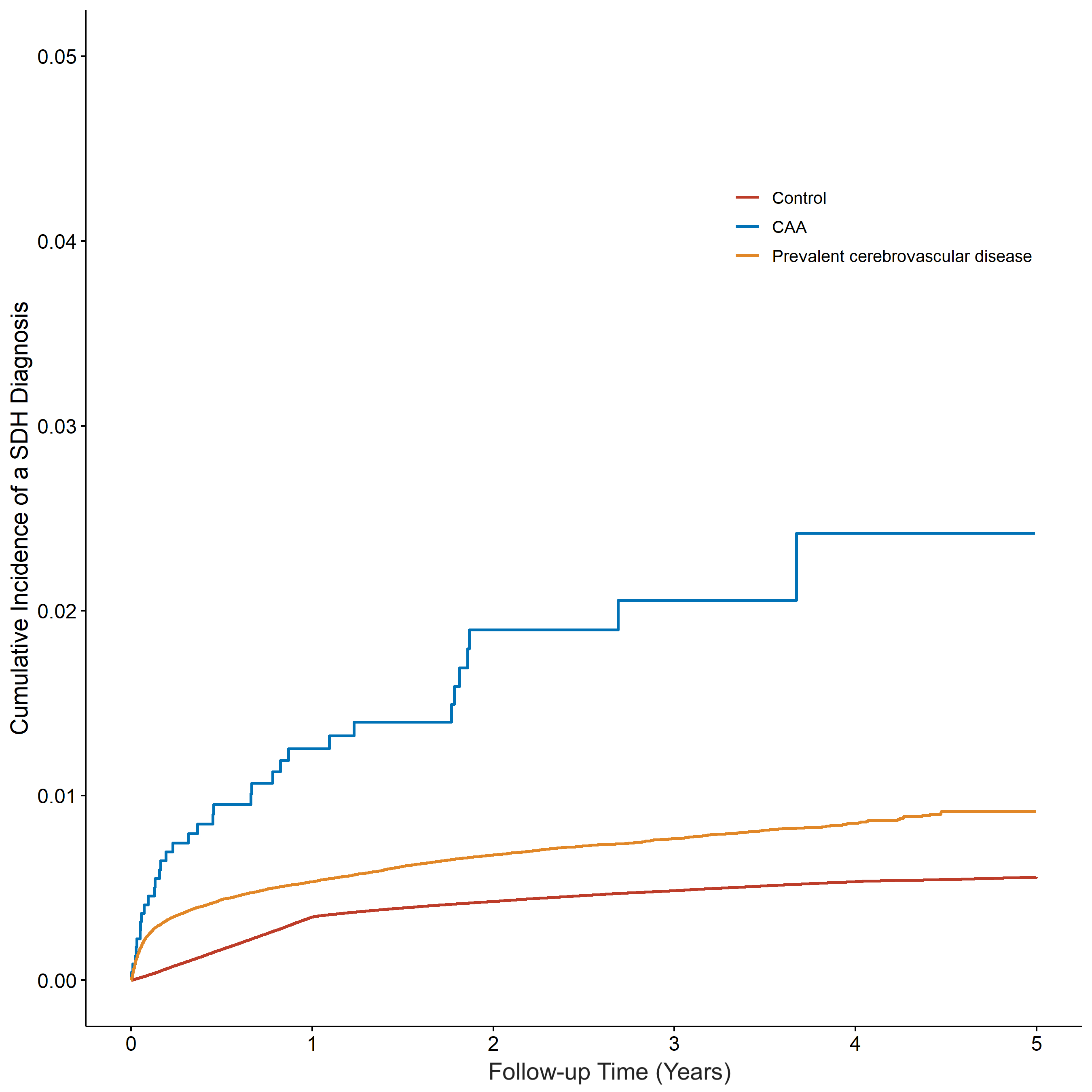 Conclusion: In a large, heterogeneous cohort, we found that CAA was associated with a 3-fold heightened risk of SDH. This risk appeared higher than that seen in patients with prevalent cerebrovascular disease. These findings further add to emerging evidence that CAA is a novel risk factor for isolated non-traumatic SDH.