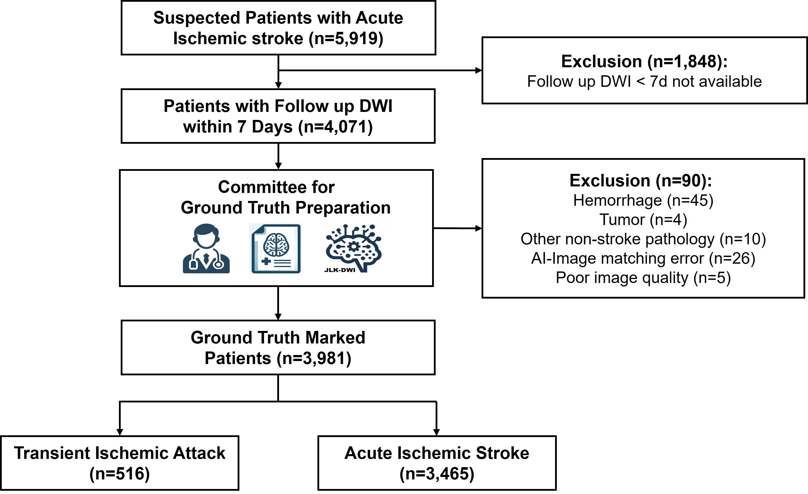 Methods From February 2017 to November 2021, 4,071 suspected acute ischemic stroke patients underwent initial and follow-up DWI. A neurologist assessed ischemic stroke based on medical records, and a neuroradiologist established the ground truth using the neurologist's evaluation, MRI reports, and AI-marked DWI images. The accuracy of AI and MRI reports was then evaluated against this ground truth. For a reader performance study, 874 challenging cases were selected: (1) infarct volume < 0.5 mL in the posterior circulation on follow-up DWI or (2) initial DWI within 3 hours of onset with infarct volume < 1.0 mL in the anterior circulation. Additionally, 80 negative and 40 positive control cases were included. Five readers (a neuroradiologist, two radiology residents, and two neurology residents) interpreted the DWIs, half with AI assistance and half without. After a 4-week washout, cases were re-evaluated with the groups reversed. We compared the area under the receiver operating characteristic curve (AUC), sensitivity, specificity, and Dice similarity coefficient (DSC) between readings with and without AI.