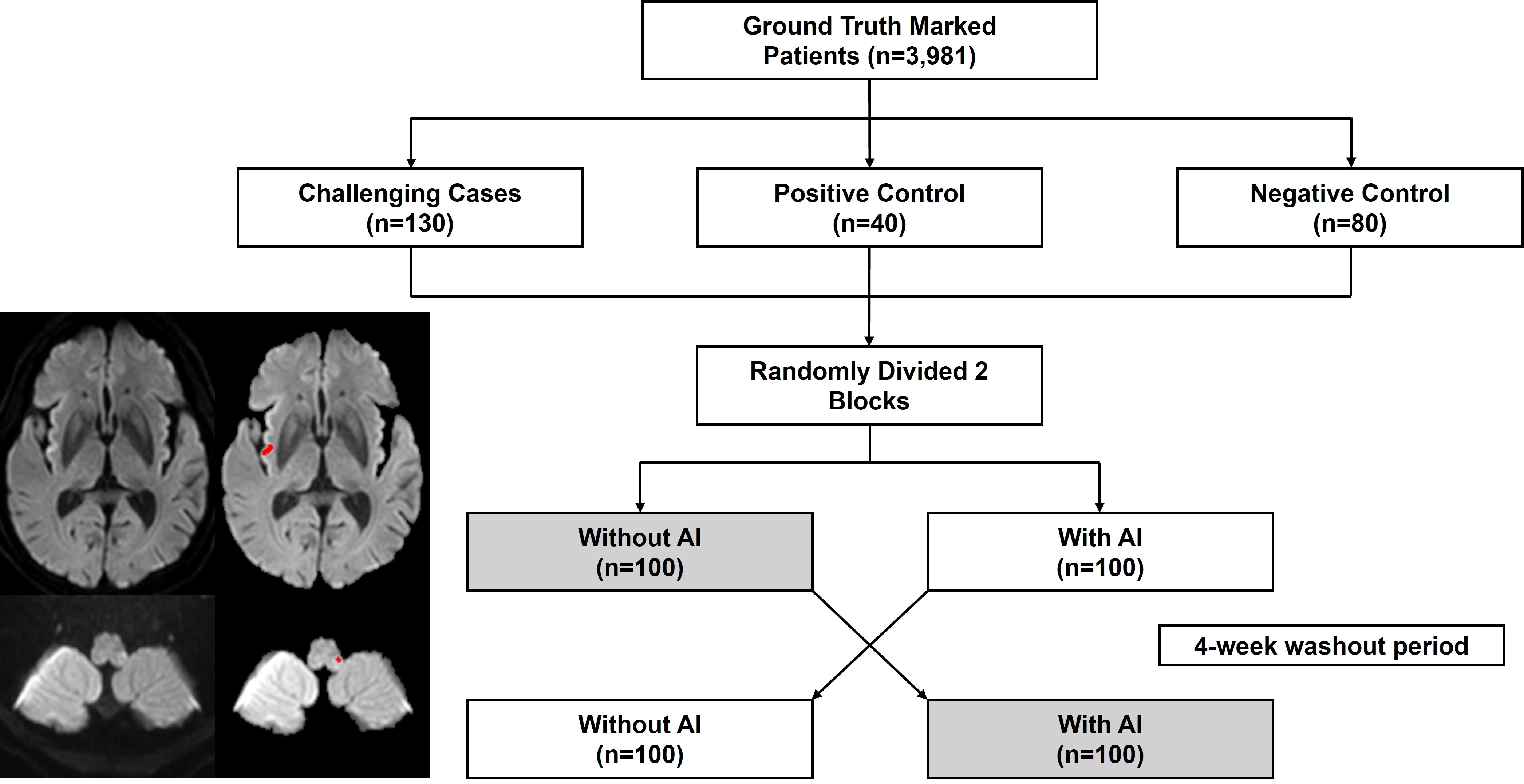 Abstract Body: Introduction Diffusion-weighted imaging (DWI) is key for detecting acute ischemic brain lesions but struggles with hyperacute or small lesions that mimic artifacts. This randomized crossover trial assessed whether an artificial intelligence (AI) solution enhances diagnostic accuracy for these challenging lesions compared to conventional interpretation.