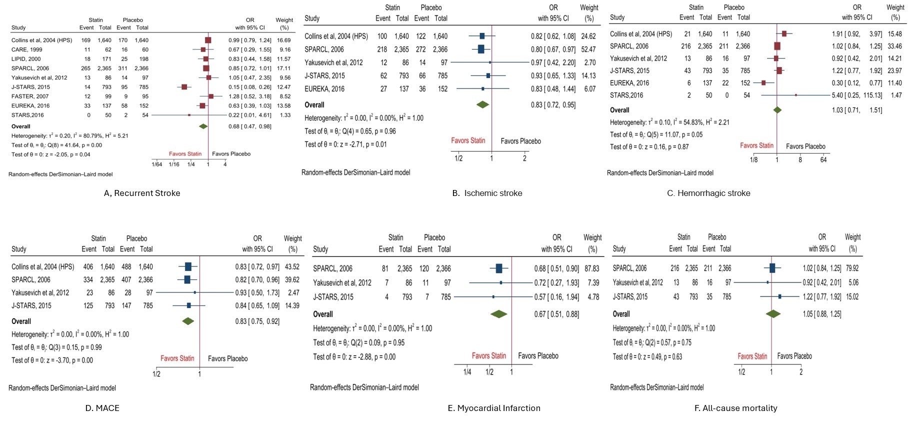 Background Statins are effective in reducing the morbidity and mortality associated with atherosclerotic cardiovascular disease. It has shown to reduce the risk of stroke and is cardioprotective in nature. However, statin might elevate the risk of hemorrhagic stroke and hence it's critically important to evaluate its efficacy and safety among stroke patients. Objective This study aims to investigate the association of statin based therapies with outcomes for patients with stroke. Methods We performed a systematic literature search on PubMed, EMBASE, and ClinicalTrials.gov for relevant randomized controlled trials (RCTs) from inspection until August 10th, 2024, without any language restrictions. Odds ratios (OR) and 95% confidence intervals (CI) were pooled using a random-effect model, and a p-value of <0.05 was considered statistically significant. Results A total of 9 randomized controlled trials with 10, 850 patients (5403 patients in the statin group, and 5447 patients in the placebo group) were included in the analysis. Mean age of patients was 65 years and mean follow up duration was 3.6 years. Pooled analysis of primary outcomes showed that statin group of patients were having lower odds of recurrent stroke (OR, 0.68(95%CI: 0.47-0.98), P=0.04), ischemic stroke (OR, 0.83(95%CI: 0.72-0.95), P=0.01), major adverse cardiovascular events (OR, 0.83(95%CI: 0.75-0.92), P<0.001), and myocardial infarction (OR, 0.67(95%CI: 0.51-0.88), P<0.001). However, the risk of all-cause mortality (OR, 1.05(95%CI: 0.88-1.25), P=0.63), and hemorrhagic stroke (OR, 1.03(95%CI: 0.71-1.51), P=0.87) was comparable between both group of patients. Conclusion This study findings suggest that statins significantly reduced the risk of recurrent stroke, ischemic stroke, and MACE. However, the risk of hemorrhagic stroke was comparable between both groups of patients.