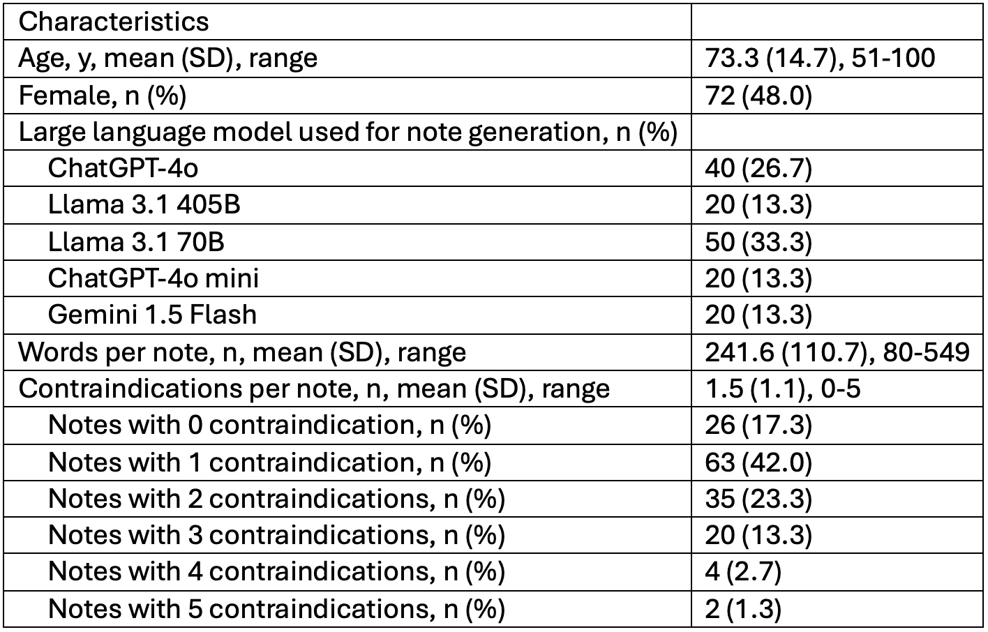 Results: A total of 150 synthetic notes were generated (ChatGPT-4o, n=40, 26.7%; Llama 3.1 405B, n=20, 13.3%; Llama 3.1 70B, n=50, 33.3%; ChatGPT-4o mini, n=20, 13.3%; Gemini 1.5 Flash, n=20, 13.3%). Each note contained on average 241.6 words (SD 110.7, range 80-549) and 1.5 contraindications (SD 1.1, range 0-5). Our tool had a sensitivity of 90.9% (95% CI, 86.3-94.3), specificity of 99.2% (95% CI, 98.8-99.5), PPV of 87.7% (95% CI, 82.7-91.7), NPV of 99.4% (95% CI, 99.1-99.6), accuracy of 98.7% (95% CI, 98.2-99.0), and F1 score of 0.892. False positives were due to the inclusion of irrelevant clinical details (n=24, 86%) and repetitive information (n=4, 14%). No hallucination has been observed. No evidence of sex bias was observed for sensitivity (p=0.06) and PPV (p=0.86). Our tool had better sensitivity for notes generated by ChatGPT-4o and Llama 3.1 405B than ChatGPT-4o mini and Gemini 1.5 Flash (95.6% vs 80.0%, p=0.003). It also had better sensitivity and PPV for notes generated by Llama 3.1 70B than ChatGPT-4o mini and Gemini 1.5 Flash (sensitivity 93.2% vs 80.0%, p=0.03; PPV 94.4% vs 83.0%, p=0.04).
