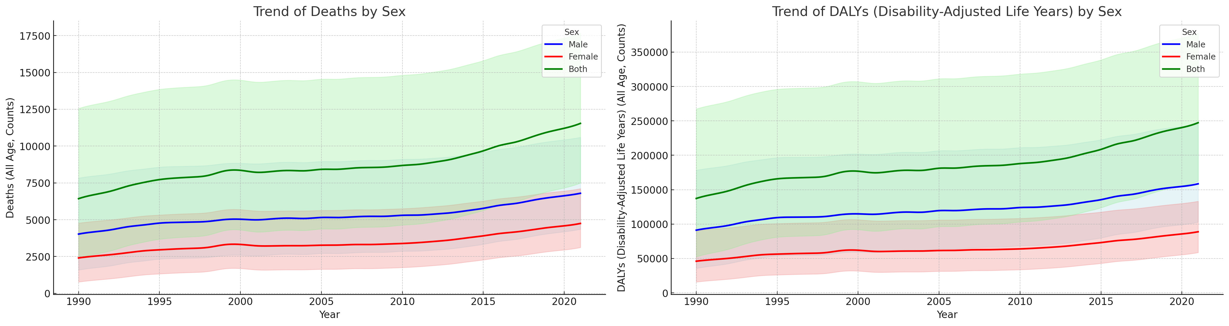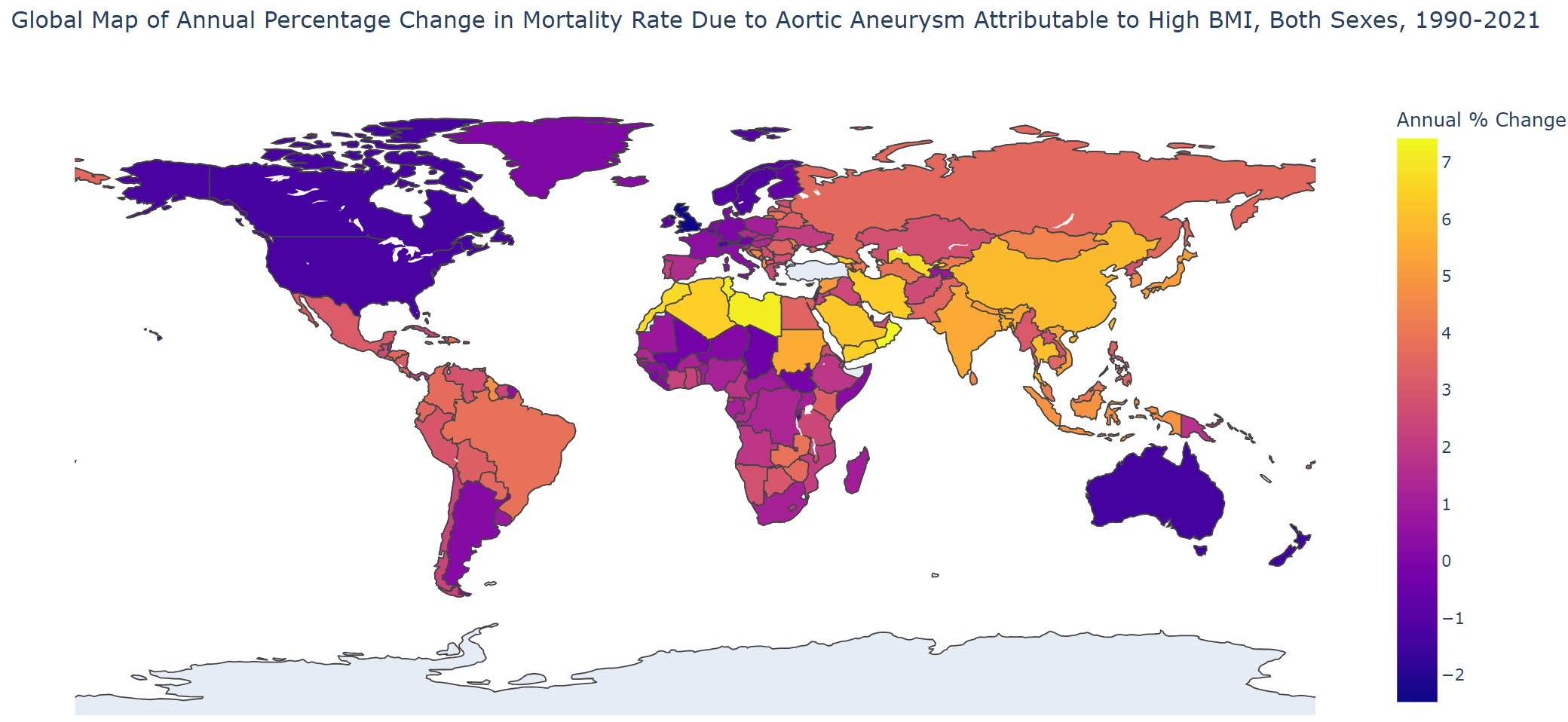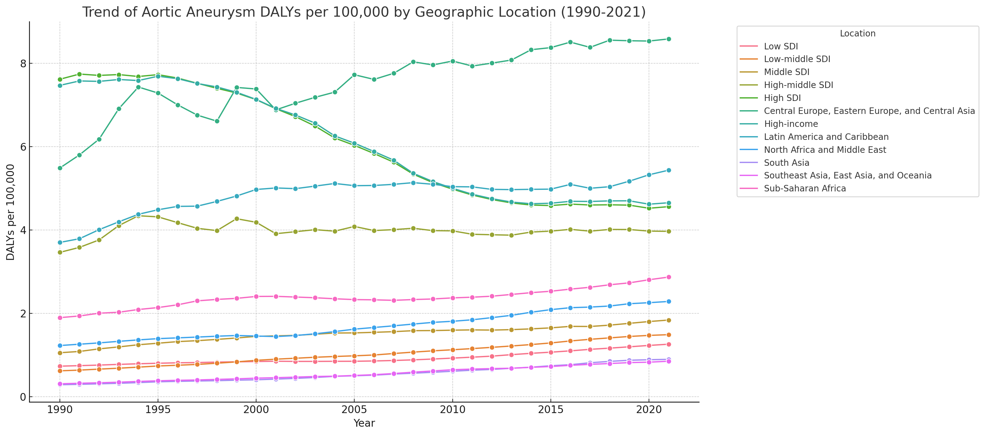 Abstract Body: Background and Aim: Aortic Aneurysm (AA) poses significant health risks globally, with its incidence often linked to various modifiable and non-modifiable factors. The global incidence of AA is increasing due to aging populations and modifiable lifestyle factors, with high Body Mass Index (BMI) identified as a key risk factor exacerbating AA through metabolic disorders, hypertension, and increased arterial wall stress, yet comprehensive global studies on its direct impact remain limited. Method: Using global burden of disease 2021 tool, we estimated deaths and disability adjusted life years(DALYs) due to AA attributable h-BMI by age, sex, year and location across the 204 countries and territories. Results: From 1990 to 2021, the global number of deaths due to AA attributable to h-BMI increased from 6,428 (95%UI: 3,450-10,799) to 11,539 (6,195-19,522), and DALYs rose from 137,241 (74,817-230,632) to 247,361 (134,536-414,707). Regionally, the highest annual percentage change (APC) in death counts was observed in high-income regions, increasing by 0.057% (4,604 of 5,255), while other regions showed a declining trend over the past three decades. Regarding DALYs, the greatest increase was in South Asia by 6.8%(1,731 of 13,663), followed by Southeast Asia, East Asia, and Oceania at 6.1% (3,765 of 23,976), lower-middle Socio-Demographic Index countries at 5.7% (1,699 of 6,839), and North Africa and the Middle East at 5.2% (2,317 of 11,271). By age, young to middle-aged adults (20-54 years) observed the highest increase in DALYs with an APC of 2.97% (24,294 of 57,025), followed by those under 70 years at 2.09% (79,032 of 150,458), and the 70+ age group at 1.65% (58,209 of 96,902). Over the last three decades, females experienced a higher increase in burden compared to males, with an APC in deaths of 2.21% (2,404 of 4,746) for females vs 1.7% (4,024 of 6,793) for males, and in DALYs of 2.14% (46,062 of 88,831) for females vs 1.18% (91,178 of 158,530) for males. Conclusion: In 2021, deaths due to AA attributable to high BMI accounted for 7.49% of all AA causes globally. The burden has increased particularly in high-income regions, among middle-aged adults, and females over the past three decades. Technological advancements and lifestyle changes have significantly contributed to the rising prevalence of obesity, exacerbating the burden of AA. Public health initiatives should prioritize reducing this burden through improved management and targeted preventive strategies.